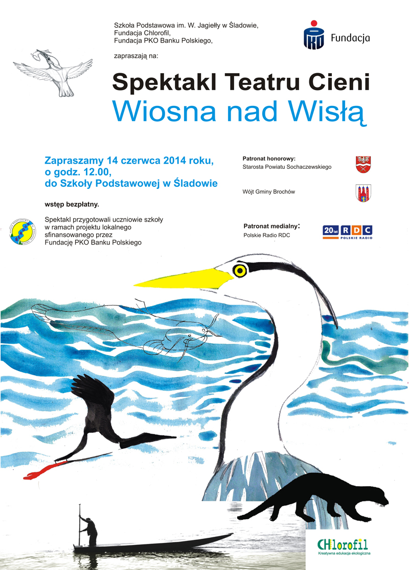 Fundacja Chlorofil, ze wsparciem finansowym Fundacji PKO Banku Polskiego, wspólnie z dziećmi ze szkoły podstawowej w Śladowie im. Władysława Jagiełły, realizuje lokalny, interdyscyplinarny projekt edukacji ekologicznej i kulturalnej: spektakl Teatru Cieni „Wiosna nad Wisłą”. Projekt realizowany jest pod patronatem honorowym starosty oschaczewskiego oraz wójta gminy Brochów, patronat medialny objęło Polskie Radio RDC.Spektakl dwukrotnie pokażemy społeczności lokalnej: na terenie gminy Brochów oraz w powiecie sochaczewskim. Fabułę, narrację, rekwizyty, dekorację i ścieżkę dźwiękową z odgłosami natury, tworzymy podczas warsztatów przyrodniczo-artystycznych. W 20 minutowym przedstawieniu odegranym i opowiedzianym przez dzieci wystąpi m.in. czapla siwa, gęś zbożowa, rybitwa białoczelna, gągoł, bielik, wydra, wiś...
