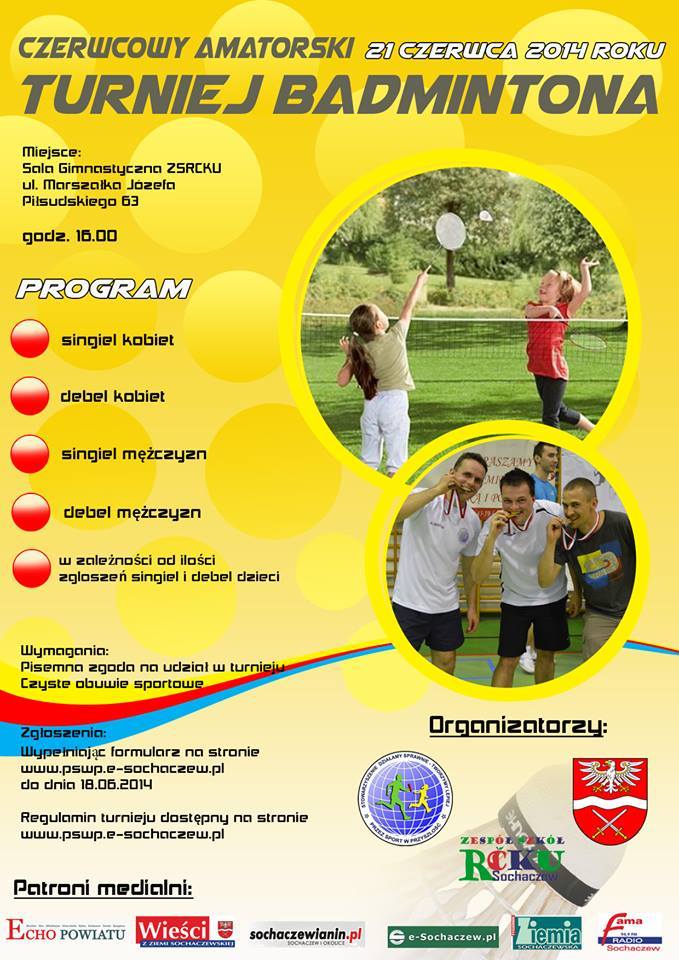 Dla wszystkich fanów tego sportu mamy dobrą wiadomość. Już 21 czerwca o godzinie 16.00 odbędzie się Czerwcowy Amatorski Turniej Badmintona. Jego organizatorami są Stowarzyszenie Działamy Sprawnie – Tworzymy Lepiej „Przez Sport w Przyszłość”, Starostwo Powiatowe w Sochaczewie oraz Zespół Szkół Rolnicze Centrum Kształcenia Ustawicznego. W programie turnieju przewidziane są: singiel i debel kobiet, singiel i debel mężczyzn oraz w zależności od liczby zgłoszeń singiel i debel dzieci. Miejscem rozgrywek będzie sala gimnastyczna ZS RCKU przy ul. marsz. J. Piłsudskiego 63.Zgłoszenia przyjmowane są do 18 czerwca 2014 r. Aby się zgłosić, należy wypełnić formularz na stronie www.pswp.e-sochaczew.pl. Na tej stronie dostępny jest również regulamin turnieju. Wymagane jest czyste obuwie sportowe, a w przypadku dzieci ta...