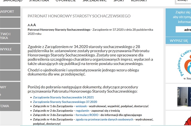 Przypominam, iż zgodnie z Zarządzeniem starosty sochaczewskiego z 28 października 2020 roku ustanowione zostały procedury przyznawania Patronatu Honorowego Starosty Sochaczewskiego. Zamysłem było ujednolicenie i usyst...