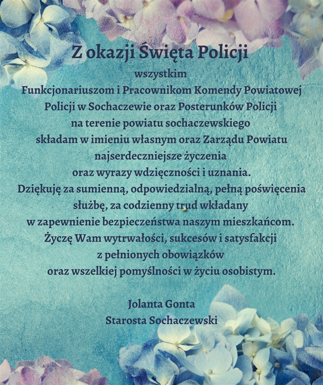 Z okazji Święta Policji wszystkim Funkcjonariuszom i Pracownikom Komendy Powiatowej Policji w Sochaczewie oraz Posterunków Policji na terenie powiatu sochaczewskiego składam w imieniu własnym oraz Zarządu P...