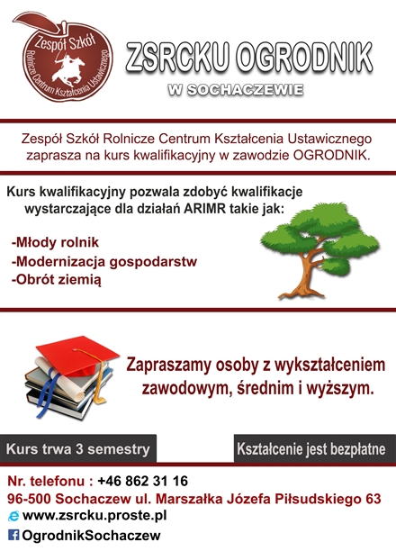 Zespół Szkół Rolnicze Centrum Kształcenia Ustawicznego w Sochaczewie - „Ogrodnik” zaprasza wszystkich chętnych z wykształceniem zawodowym, średnim i wyższym na bezpłatny kurs kwalifikac...