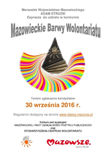 Marszałek Województwa Mazowieckiego już po raz szósty ogłosił konkurs Mazowieckie Barwy Wolontariatu. Celami Konkursu są przede wszystkim: popularyzowanie i wyjaśnianie znaczenia wolontariatu, propagowan...
