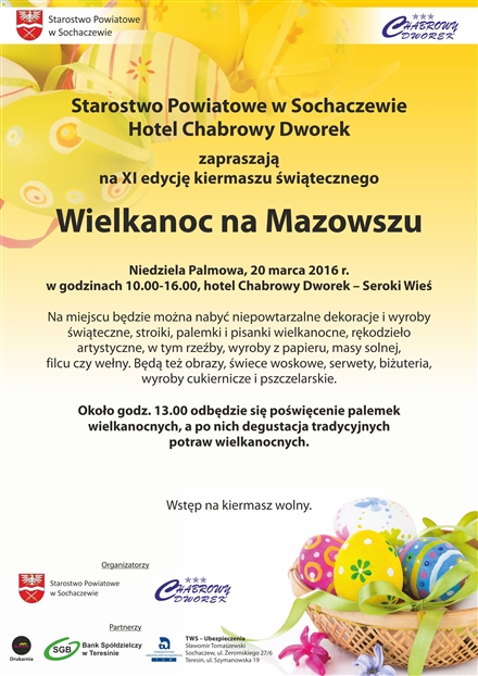 Niedziela Palmowa rozpoczyna Wielki Tydzień. Tradycyjnie w ten dzień – już po raz jedenasty Starostwo Powiatowe w Sochaczewie z hotelem Chabrowy Dworek organizuje kiermasz świąteczny „Wielkanoc na ...