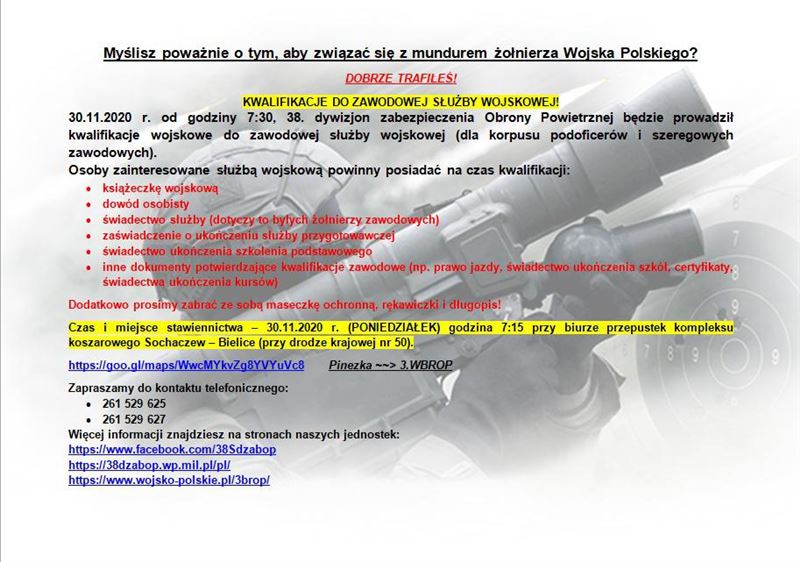 Więcej informacji można uzyskać pod nr tel.: 261 529 625, 261 529 267 oraz na stronach internetowych: https://38dzabop.wp.mil.pl/pl/ , https://www.facebook.com/38-Sdzabop , https://www.wojsko-polskie.pl/3brop/ .