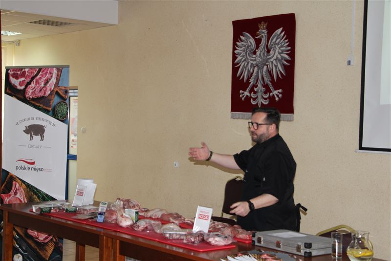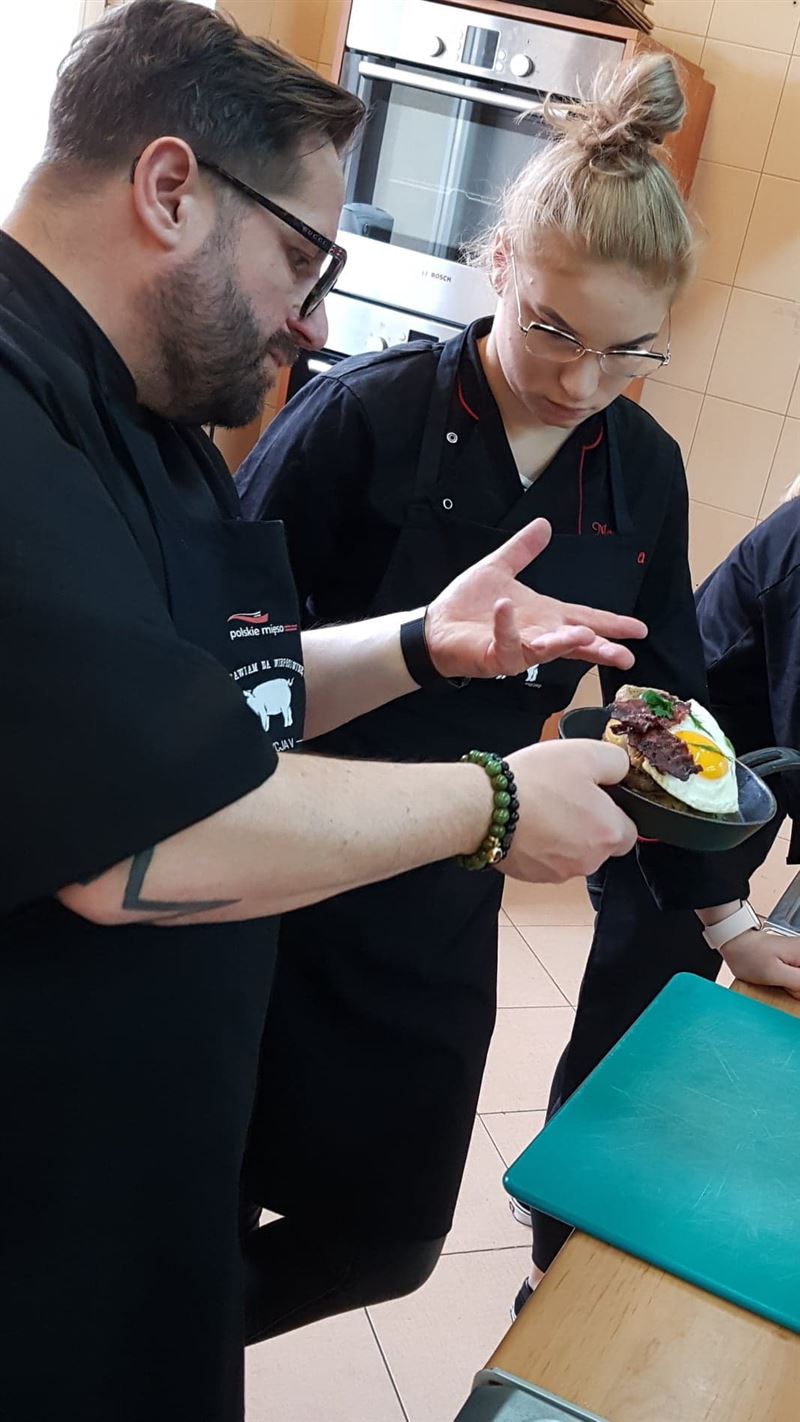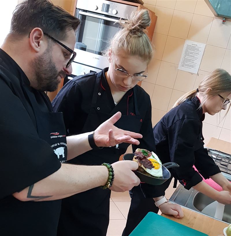 12 marca br. Zespół Szkół RCKU miał przyjemność gościć Akademię Kulinarną Marcina Budynka, zaproszeni goście wygłosili prelekcję z zakresu obróbki technologicznej mięsa wieprzowego oraz jego wartości odżywczej. Część warsztatowa przebiegała w pracowni gastronomicznej w czasie praktycznej nauki zawodu i wzięło w niej udział 20 uczniów klasy 2 TŻG - technikum żywienia i usług gastronomicznych. Uczniowie poznali nowoczesne metody obróbki mięsa, sposoby marynowania mięsa, kompozycje smakowe i aranżacje potraw. Pod okiem profesjonalnych kucharzy uczestnicy spotkania przygotowali wiele potraw z mięsa wieprzowego.