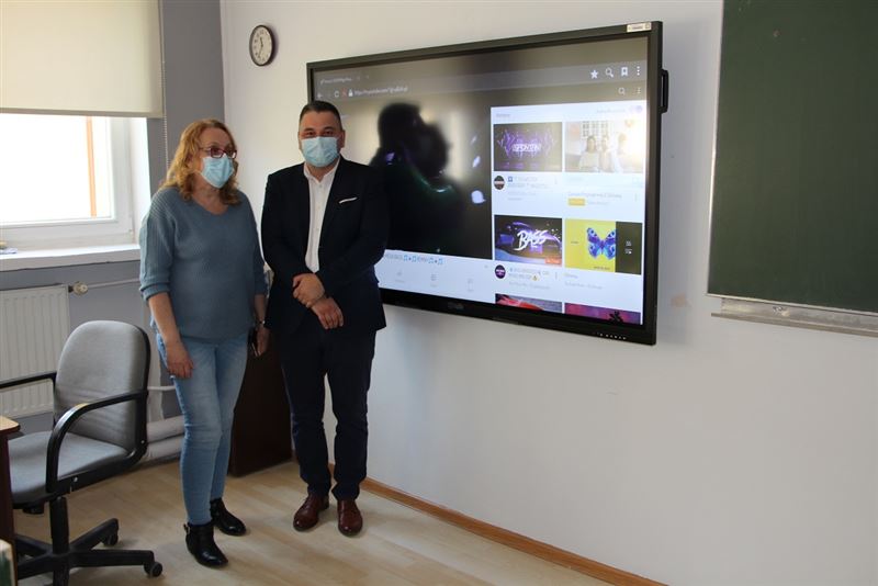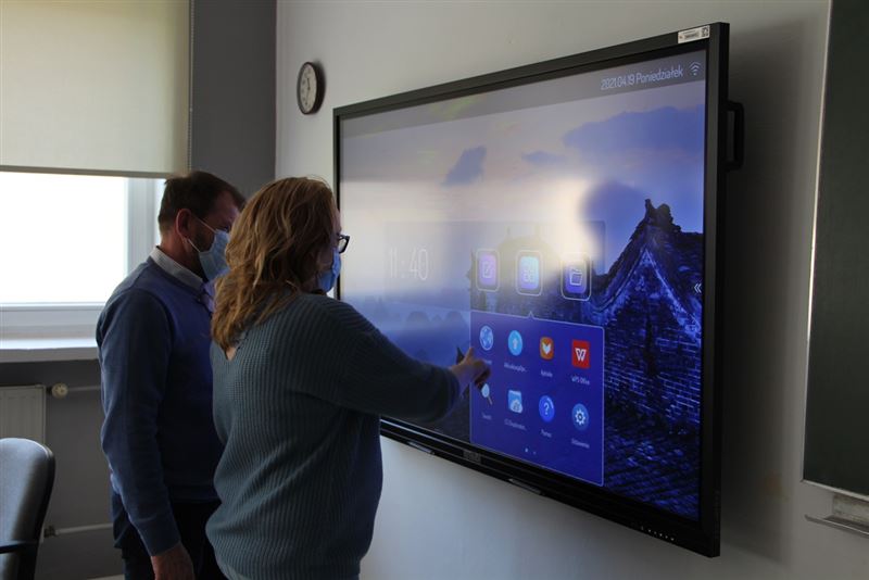 Na zakończenie spotkania Pani Starosta została poproszona o symboliczne pierwsze uruchomienie jednego z 7 monitorów interaktywnych, zakupionych z budżetu szkoły lub pozyskanych z różnych projektów. Są to sprzęty najnowszej generacji, pracujące w technologii 4K, o przekątnej ekranu 75”, działające samodzielnie lub w połączeniu z komputerem przenośnym.
