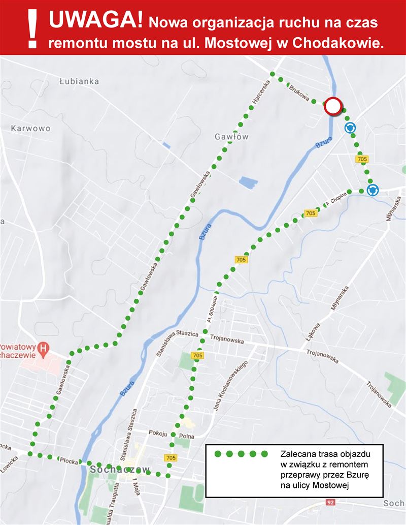 Na czas zamknięcia odcinka drogi została zmieniona organizacja ruchu i wyznaczono objazdy. Szczegóły na dołączonej mapie.