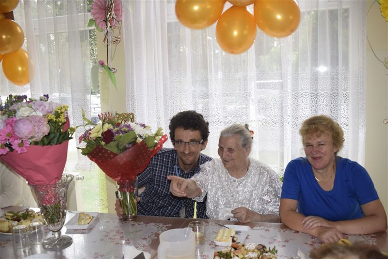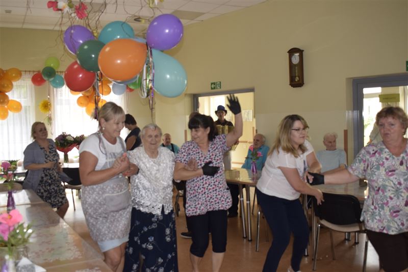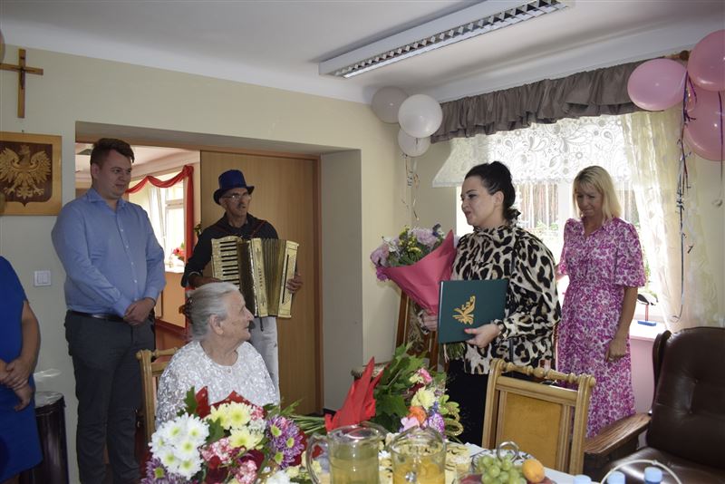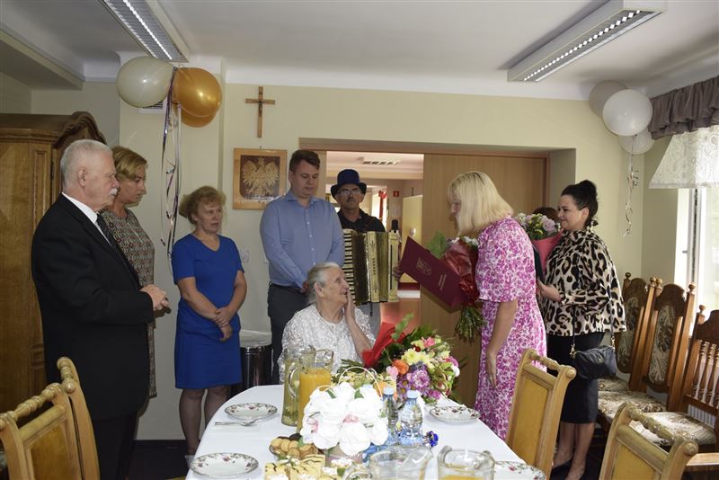 Szanownej Jubilatce w imieniu personelu i mieszkańców życzenia złożył dyrektor Konrad Jakubowski i obdarował ją pięknym bukietem kwiatów. Na uroczystość przybył wnuczek pani Marianny. Jubilatka odebrała listy gratulacyjne i kwiaty od starosty sochaczewskiego Jolanty Gonta, które w jej imieniu przekazała dyrektor PCPR Katarzyna Kajak oraz kierownik KRUS Elwiry Chodakowskiej-Malara. W pięknie udekorowanej z tej okazji stołówce, goście przywitali panią Marianne tortem i odśpiewali jej gromkie 200 lat. Na imprezie przygrywał niezawodny akordeonista pan Gienio, który wszystkim uczestnikom tej uroczystości umilał czas dźwiękiem i piosenką. Nie zabrakło tańców, w których uczestniczyła także szanowna Jubilatka. Życzymy kolejnych pięknych jubileuszy i następnych stu lat.