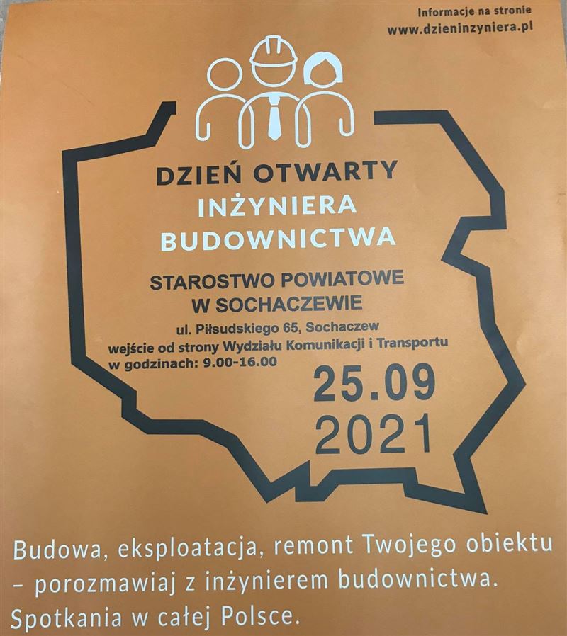 Starostwo Powiatowe w Sochaczewie i Powiatowy Inspektorat Nadzoru Budowlanego serdecznie zapraszają do uczestnictwa w akcji „Dzień Otwarty Inżyniera Budownictwa. Budowa, eksploatacja, remont Twojego obiektu”. Odbędzie się ona w najbliższą sobotę, 25 września w godz. od 9.00 do 16.00 w siedzibie Starostwa, wejście od strony Wydziału Komunikacji i Transportu.