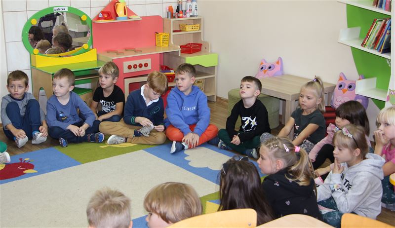 Sześciolatki z grupy „Sówki” powitały swego gościa z radością i uśmiechem na twarzy, po czym wygodnie usiadły, by wysłuchać opowiadania „Praca nie zając, nie ucieknie” z książki pt. „Siódme niebo. Przygód nie tylko językowych ciąg dalszych”. Wybrany utwór chyba przypadł im do gustu, bo po zakończeniu śmiało i bez problemu odpowiadały na pytania zadawane przez wicestarostę, związane oczywiście z przeczytaną wcześniej bajką. Sam wicestarosta opowiedział dzieciom o pracy w urzędzie, mówił, jakie sprawy mogą w Starostwie załatwić ich rodzice i czym on sam zajmuje się w swej pracy na co dzień.