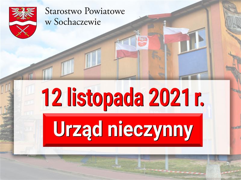 Informujemy, że w piątek, 12 listopada br. Starostwo Powiatowe w Sochaczewie (mieszczące się przy ul. marsz. J. Piłsudskiego 65) będzie NIECZYNNE. Dzień ten jest dniem wolnym w zamian za święto przypadające w sobotę, dnia 25 grudnia. Ponadto, informujemy, iż również w tym dniu nie będą pracować placówki powiatowe mieszczące się w budynku Starostwa, tj. Powiatowe Centrum Pomocy Rodzinie, Powiatowy Zespół Edukacji oraz Powiatowy Inspektor Nadzoru Budowlanego w Sochaczewie.