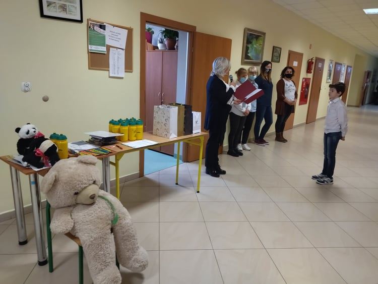 Potem mieliśmy wewnętrzną szkolną uroczystość – podsumowanie konkursów, w których nasi uczniowie brali udział w ostatnim czasie. Dyplomy i nagrody otrzymali zdobywcy zwycięskich miejsc oraz wyróżnień w konkursach pozaszkolnych: literackim „List do taty”, ogłoszonym przez Senat Rzeczypospolitej Polskiej oraz plastycznym „Do szkoły idziemy, bezpieczni być chcemy”, organizowanym przez Szkolny Ośrodek Wychowawczy Mocarzewie.
