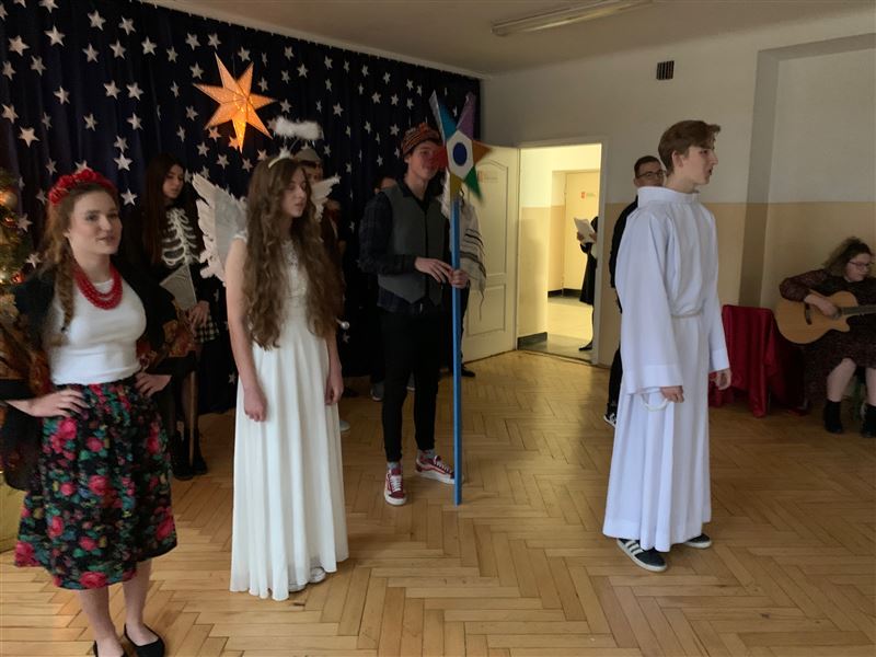 Było uroczyście, świątecznie, o co postarali się zarówno uczniowie jak i nauczyciele. Ci pierwsi przygotowali jasełka. Sięgnęli po współczesny tekst, z licznymi elementami humorystycznymi, ale przede wszystkim ze szlachetnym przesłaniem. Zachwycili zarówno umiejętnościami recytatorskimi, wokalnymi jak i kostiumami. Okazuje się, że szafa Pauliny Pabiańczyk, która wraz z uczniami przygotowała jasełka, kryje różne skarby, które w tym momencie okazały się bezcenne. Była więc gwiazda betlejemska strój regionalny, żydowski tałes przywieziony z Jerozolimy, anielskie skrzydła i kostium kostuchy. W jasełkowym widowisku wystąpili: Rafał Kiełbasiński i Mateusz Fortuniak 4ET, Maksymilian Nowak i Mateusz Kordzi 4AT, Kamila Geras, Marta Charazińska, Natalia Płachciańska i Karolina Reszka 3 ALG, Piotr Olkowicz i Jakub Nowak 3 CTG oraz Mateusz Gawor 3 BTP.