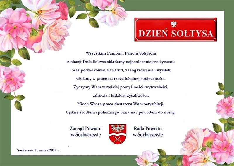 Do wszystkich Sołtysów z Powiatu Sochaczewskiego w dniu ich święta - Zarząd Powiatu w Sochaczewie i Rada Powiatu w Sochaczewie kieruje serdeczne życzenia!