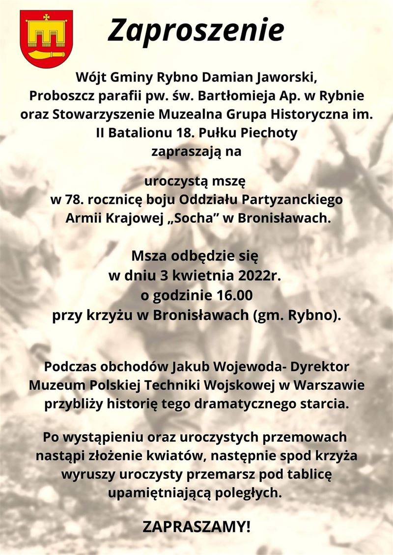 Stowarzyszenie Muzealna Grupa Historyczna im. II Batalionu 18. Pułku Piechoty oraz Urząd Gminy w Rybnie zapraszają na uroczystą mszę w 78. rocznicę boju oddziału partyzanckiego Armii Krajowej „Socha” w Bronisławach.