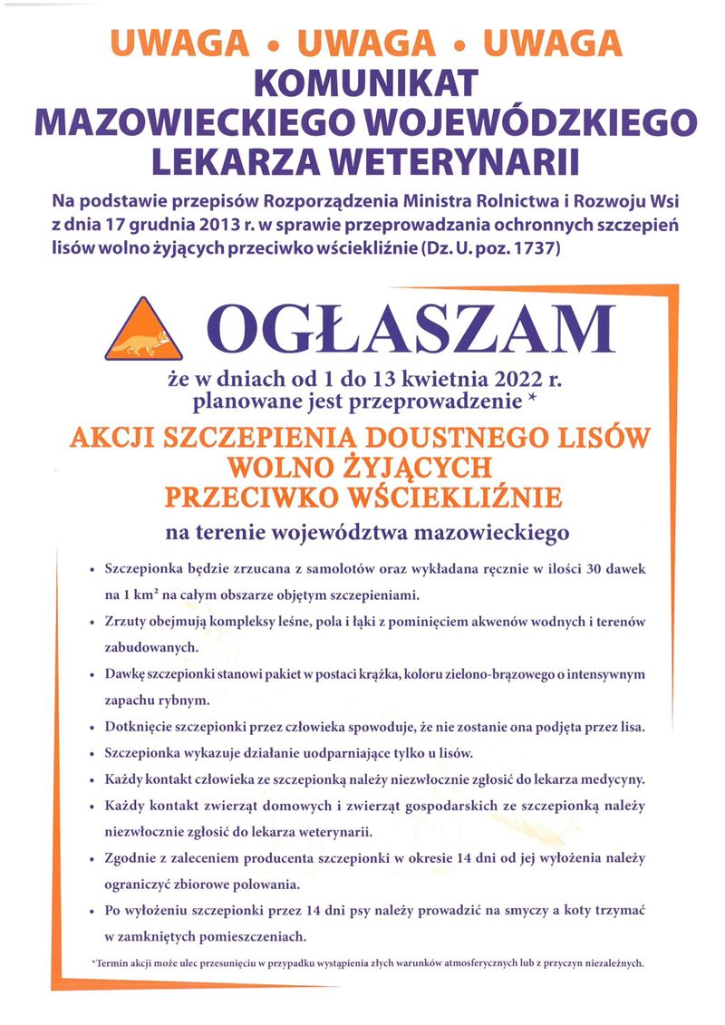 Mazowiecki Wojewódzki Lekarz Weterynarii ogłasza, że w dniach od 1 do 13 kwietnia 2022r. na terenie województwa mazowieckiego planowane jest przeprowadzenie akcji szczepienia doustnego lisów wolno żyjących przeciwko wściekliźnie.