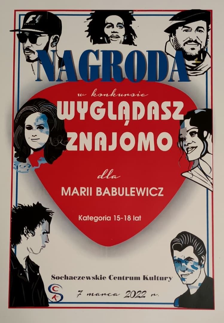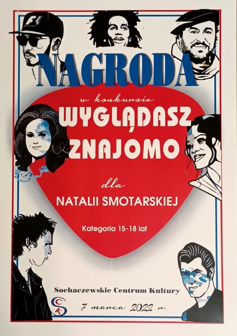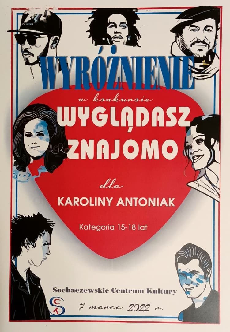 Kolejna edycja konkursu „Wyglądasz znajomo”, organizowanego przez Sochaczewskie Centrum Kultury przyniosła sukces uczennicom z Iwaszkiewicza. Zadaniem uczestników konkursu było ucharakteryzowanie się na swojego idola i uwiecznienie efektu metamorfozy na zdjęciu. Konkurs adresowany był do dzieci i młodzieży w wieku od 6 do 18 lat. Maria Babulewicz i Natalia Smotarska zdobyły główną nagrodę, a Karolina Antoniak wyróżnienie. Marta i Natalia upodobniły się do Chuuya Nakahara i Dazai Osamu z Bungou Stray, a Karolina do piosenkarza Ralpha Kamińskiego. Wszystkie dziewczyny są uczennicami klasy pierwszej społecznej LO, a osobą, która zachęciła i wspomagała je w pracy był Zdzisław Chlebowski. Gratulujemy!