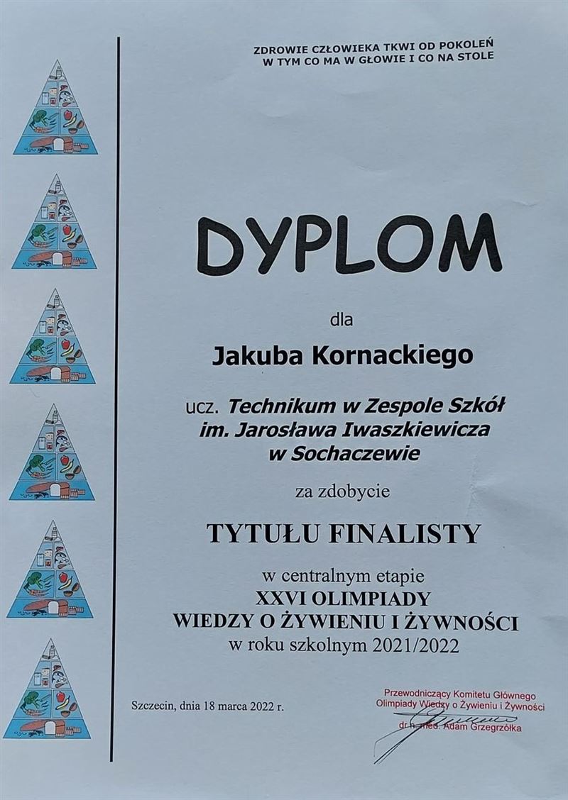 Jakub Kornacki uczeń 4 klasy technikum żywienia i usług gastronomicznych w Zespole Szkół im. Jarosława Iwaszkiewicza został finalistą XXVI Olimpiady Wiedzy o Żywieniu i Żywności. Tematyką wiodącą tej edycji było „Żywienie w profilaktyce chorób układu krążenia” i obejmowało: epidemiologię nadciśnienia, biochemię ciśnienia tętniczego, charakterystykę nadciśnienia jako jednostki chorobowej, mikrobiotę przewodu pokarmowego i jej potencjalny związek z nadciśnieniem tętniczym, dietoterapię nadciśnienia tętniczego, zalecenia dietetyczne w prewencji i wyrównaniu nadciśnienia tętniczego oraz interdyscyplinarne wspomaganie leczenia nadciśnienia.