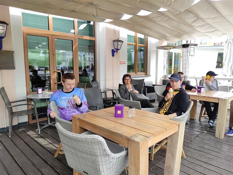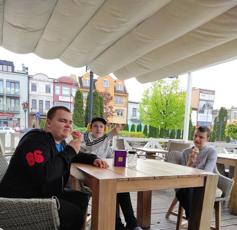 Dodatkowo atutem wyjazdu było poznanie pobliskich instytucji i ich przeznaczenia: Urzędu Skarbowego i Komendy Powiatowej Policji w Sochaczewie. Bardzo przyjemnym i istotnym punktem wycieczki była wizyta w kawiarni. Uczniowie czytali etykiety i samodzielnie dokonywali wyboru lodów, wyrażali prośbę o zakup ( trening komunikacji funkcjonalnej), płacili, ćwiczyli umiejętność czekania i odraczania.