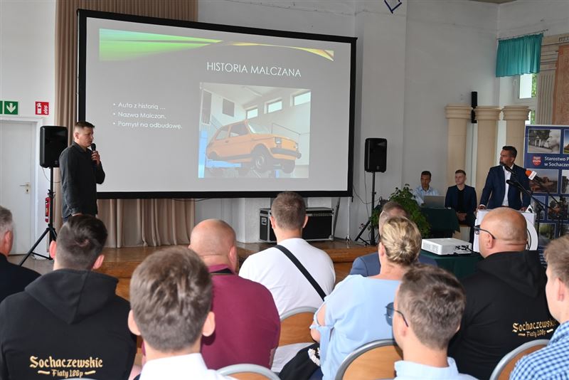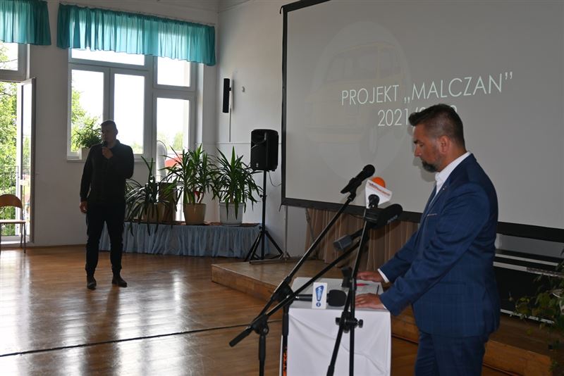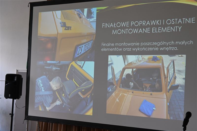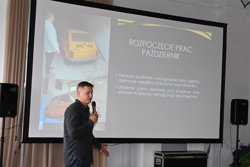 Wydarzenie podsumowujące projekt „Malczan” przyjęło bardzo uroczysty charakter i podzielone było na dwie części. W pierwszej z nich zapoznano uczestników z przebiegiem robót od A do Z. Nauczyciel Radosław Szwarczewski w sposób wyczerpujący opowiadał o trwających dziewięć miesięcy pracach i problemach, z jakimi musieli radzić sobie uczniowie oraz on sam. – Po drodze wychodziło bardzo dużo zaskakujących niespodzianek, ale kolejno dawaliśmy dobie z nimi radę. Swój udział w renowacji pojazdu miało ok. 10-15 uczniów, którzy pracowali po lekcjach, czasem też w dni wolne od zajęć. Cieszę się, że wszystko się udało – podsumował.