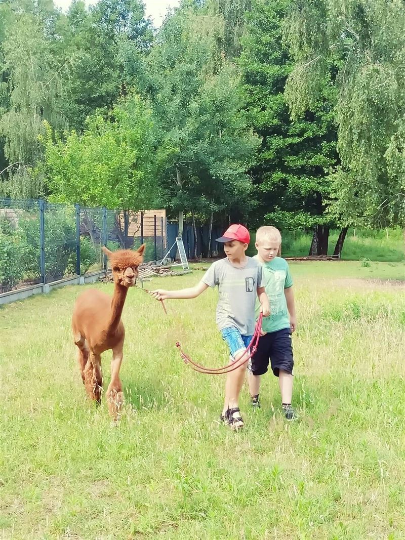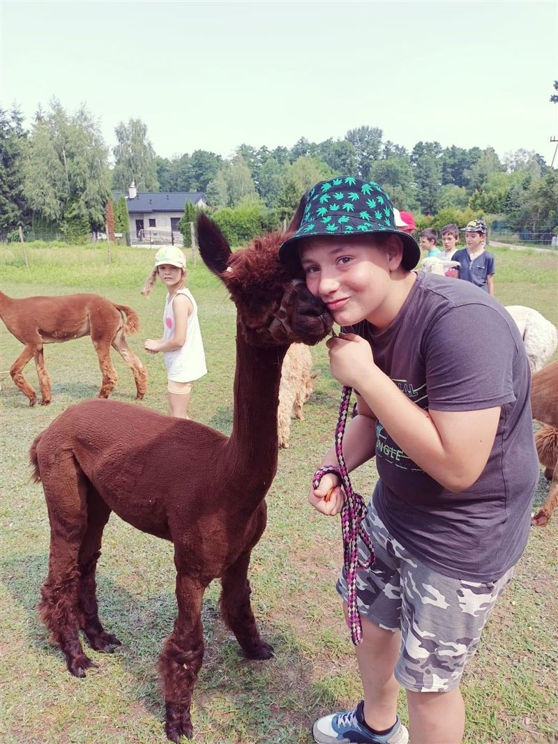 W czwartek udaliśmy się na niezapomnianą wycieczkę do zagrody „A może Alpaka”. Dzieci mogły karmić alpaki, jak również głaskać i przytulać się do nich. Uczniowie wzbogacili swoją wiedzę na temat pochodzenia zwierząt, ich hodowli i pielęgnacji. Po karmieniu alpak mogliśmy wziąć je na spacer. To był najbardziej wyczekiwany punkt wycieczki przez uczniów. Alpakoterapia okazała się bardzo ciekawą forma terapii. Alpaki uwielbiają dotyk, tak jak i my. Dotyk uspokaja, zmniejsza poziom stresu i łagodzi różnego rodzaju napięcia. Po powrocie do szkoły pokolorowaliśmy kolorowanki przestawiające zwierzęta spotkane w trakcie półkolonii.