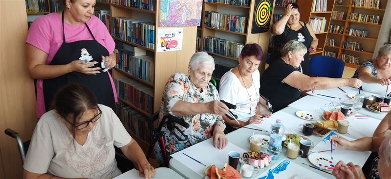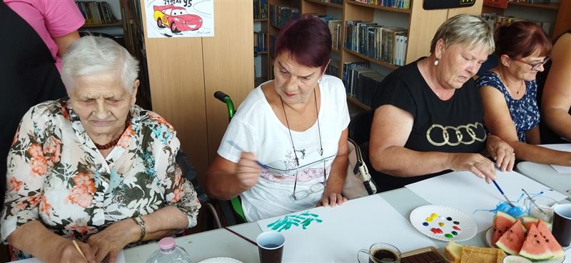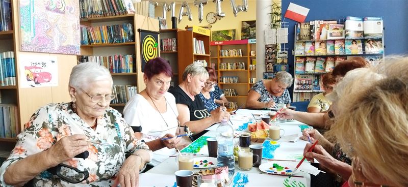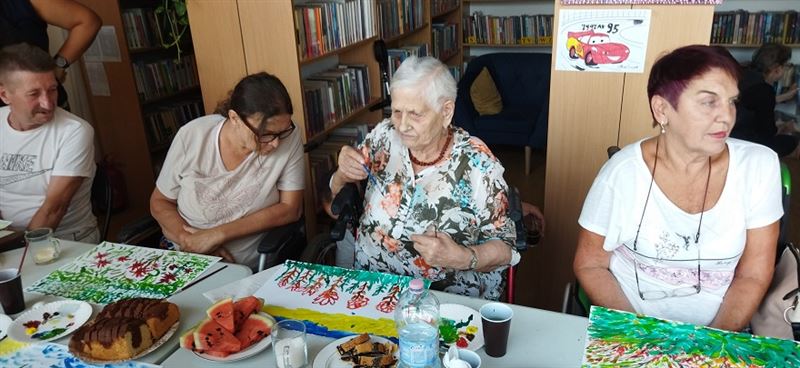 Na zaproszenie Gminnej Biblioteki Publicznej w Młodzieszynie, w środę 24 sierpnia br. mieszkańcy Domu Pomocy Społecznej w Młodzieszynie wybrali się na spotkanie artystyczne na malowanie kwietnej łąki. Do tego miały posłużyć farby akrylowe. Tym razem odbyły się warsztaty ŁĄKI KWIETNE z Kołem Gospodyń Wiejskich "HARDE BABKI" z Młodzieszyna. Powstały bardzo ciekawe prace, które cieszą oko. Prace te zawisną na ścianie w naszym domu. Będą cieszyły oko każdego mieszkańca, bo są bardzo radosne. To już kolejne spotkanie z Letnią Senioriadą , za które bardzo serdecznie dziękujemy. Do zobaczenia już niebawem na posumowaniu warsztatów,