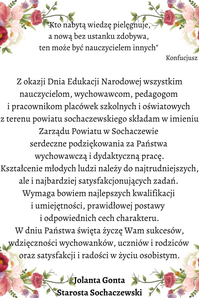 Z okazji Dnia Edukacji Narodowej wszystkim nauczycielom, wychowawcom, pedagogom i pracownikom placówek szkolnych i oświatowych z terenu powiatu sochaczewskiego składam w imieniu Zarządu Powiatu w Sochaczewie serdeczne podziękowania za Państwa wychowawczą i dydaktyczną pracę.