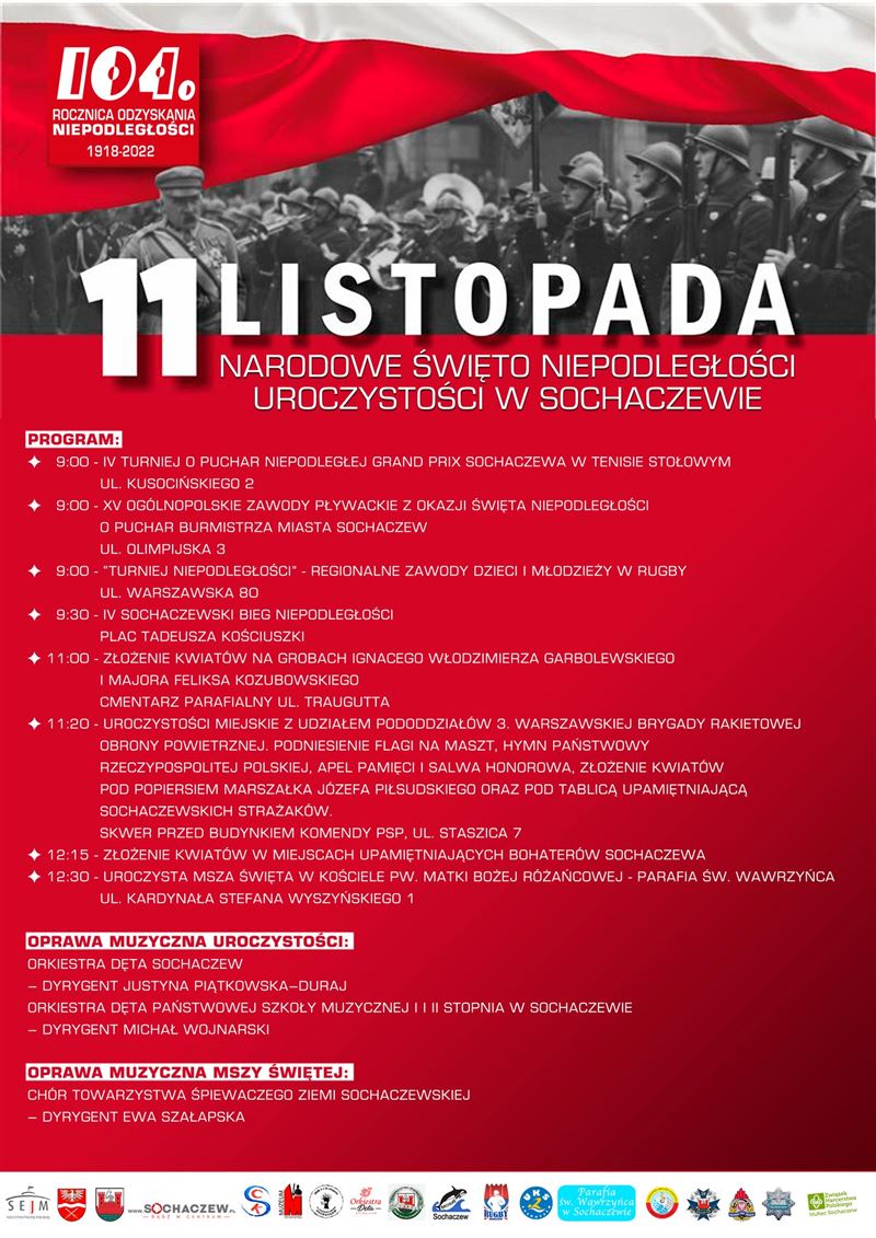 Poniżej zamieszczamy plakat z programem obchodów na 11 Listopada, zaplanowanych w Sochaczewie - z okazji rocznicy odzyskania przez Polskę Niepodległości.