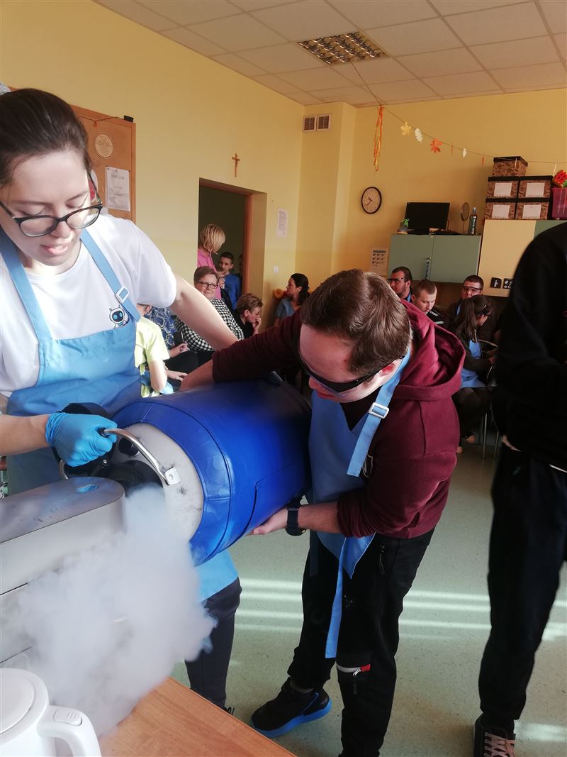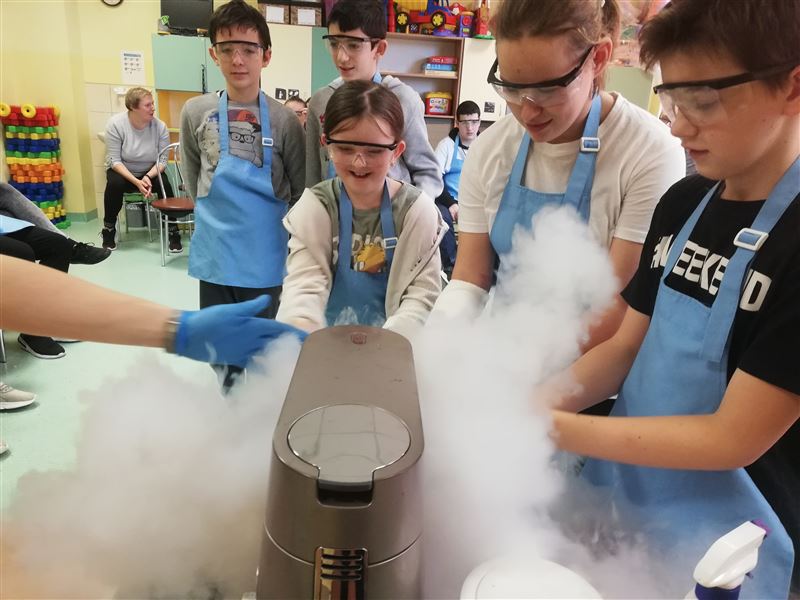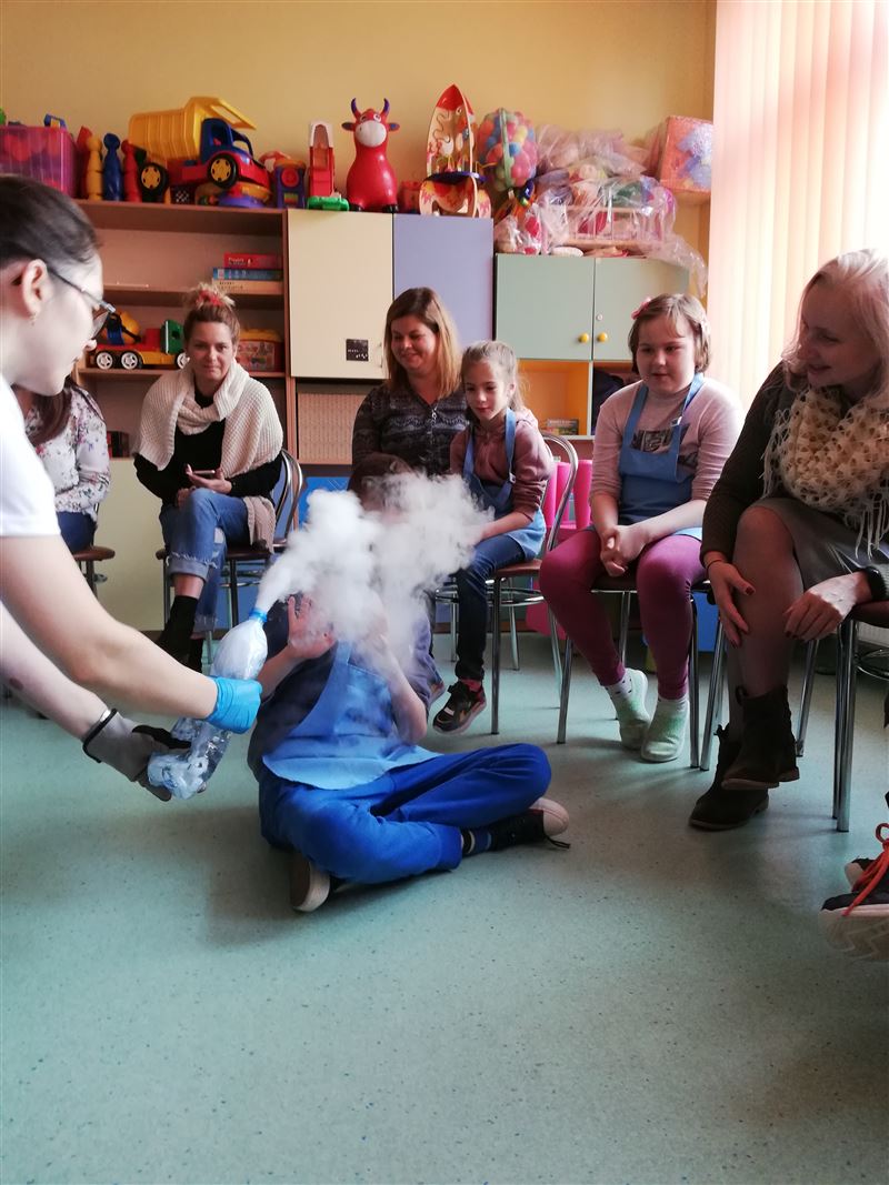 Odkryliśmy tajemnice samopompujących się balonów, dymiących smoczych chrupków, parowego gejzeru, rosnącej piany, zamarzanych róż oraz zamarzanej podłogi. Za pomocą ciekłego lodu o temperaturze -80 stopni przyrządziliśmy lody sorbetowe, które następnie próbowaliśmy. Coś pysznego!