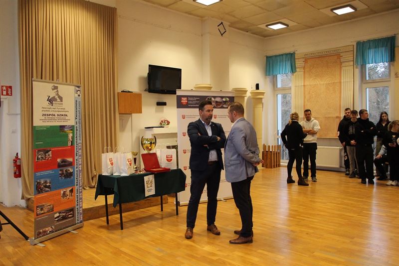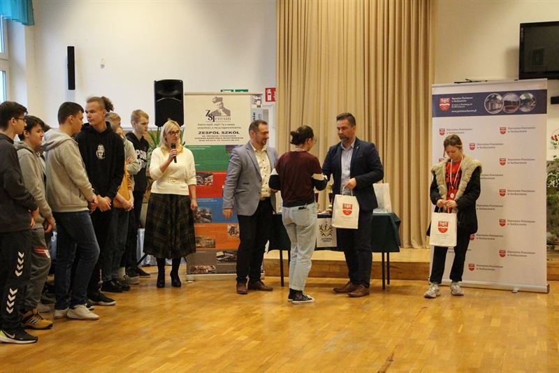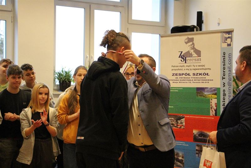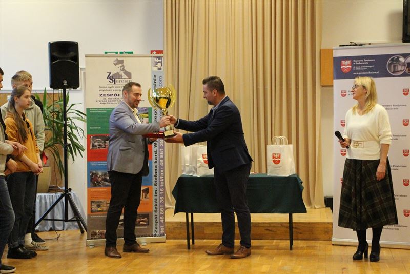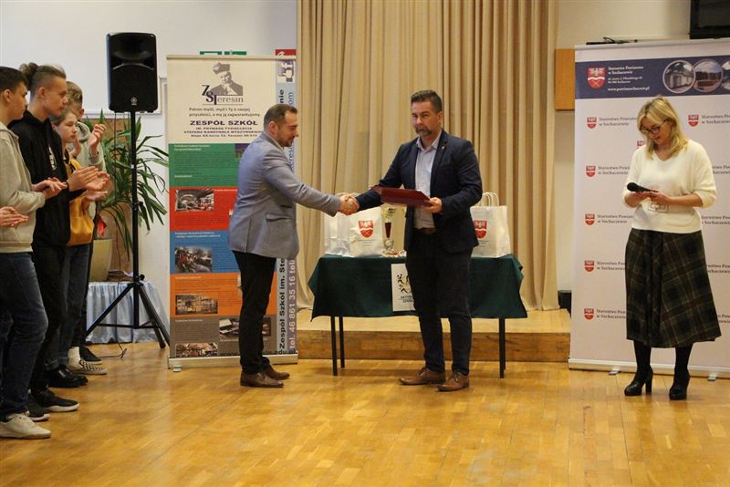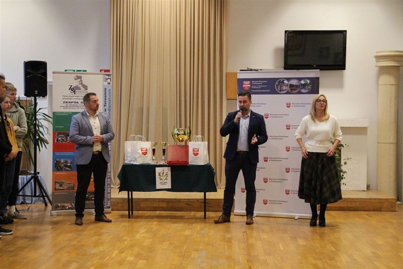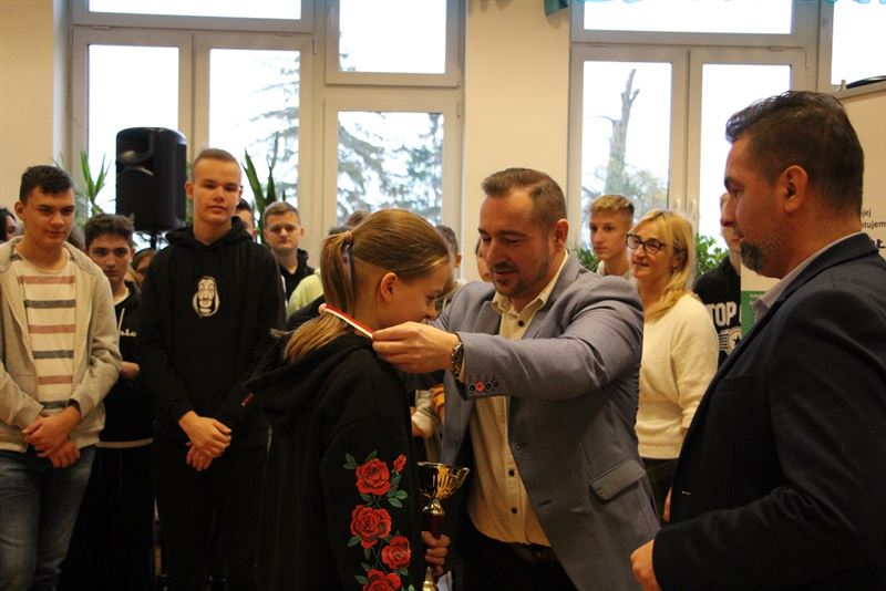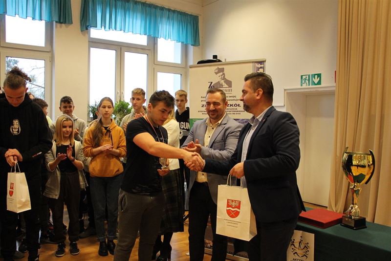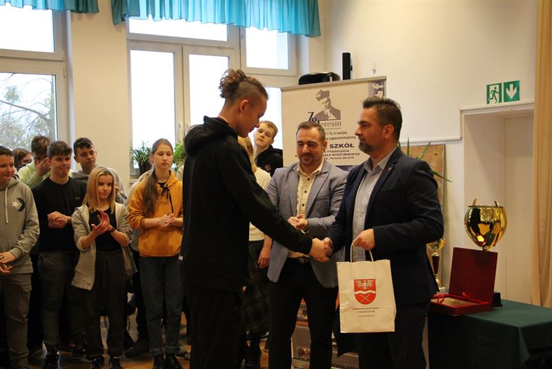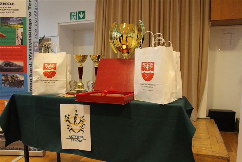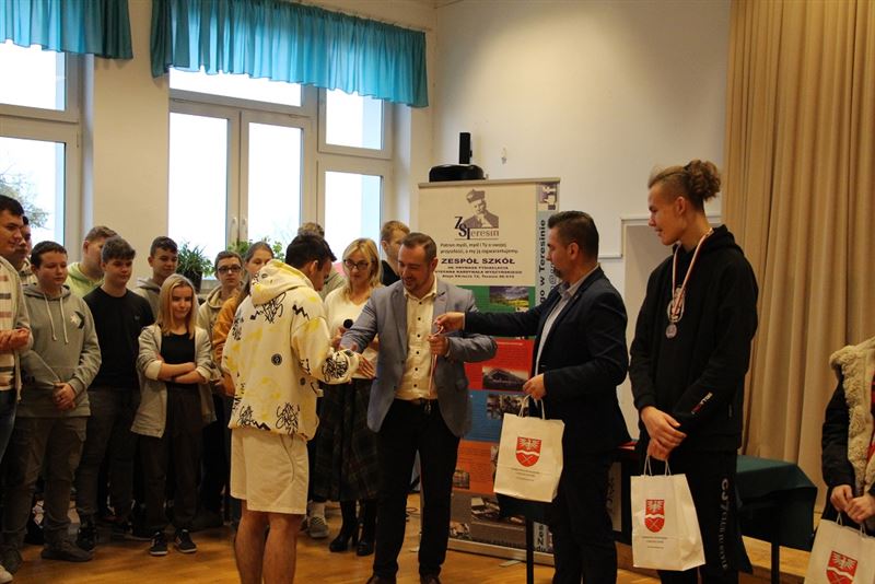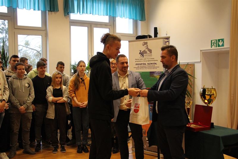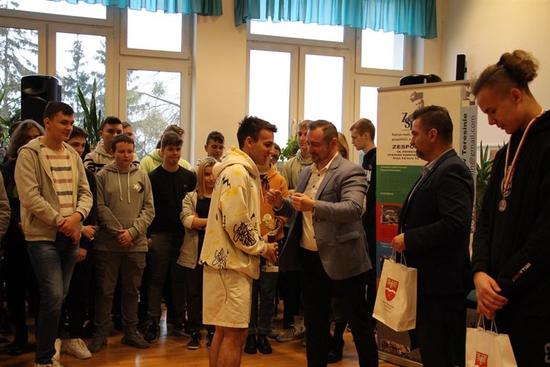 Zanim rozdano nagrody, doszło do oficjalnego przekazania okazałego pucharu wraz z okolicznościowym drzewcem za drugie miejsce w wojewódzkim konkursie „Aktywna Szkoła”. Z rąk Marcina Odolczyka, dyrektora Wydziału Promocji, Kultury i Sportu w Starostwie Powiatowym w Sochaczewie trofea odebrał Krzysztof Paradowski, dyrektor Zespołu Szkół w Teresinie. – Dziękuję wszystkim uczniom, Radzie Pedagogicznej, a przede wszystkim nauczycielom wychowania fizycznego za całokształt działań, które mają na celu nie tylko podniesienie sprawności fizycznej młodzieży, poprawę tężyzny fizycznej oraz promocję zdrowego trybu życia, ale też prowadzą do tego, że jest to zauważalne w środowisku, a co za tym idzie, nasza szkoła otrzymuje kolejne, bardzo ważne wyróżnienie i to na tle wojewódzkim – mówił dyrektor Paradowski. Z kolei obecny Marcin Odolczyk, pełniący też funkcję sędziego głównego turnieju, powiedział – W imieniu Zarządu Powiatu gratuluję szkole sportowego sukcesu na Mazowszu. Dziękuję, że zawsze można liczyć na tę szkołę, jeśli chodzi o starty w zawodach organizowanych przez Powiatowy Szkolny Związek Sportowy i trzymam kciuki za dalsze sukcesy – mówił Marcin Odolczyk – Pamiętajcie, bądźcie w życiu jak najbardziej pozytywnie aktywni, dzięki temu osiągniecie więcej – zwracał się do młodzieży dyrektor WPKiS.