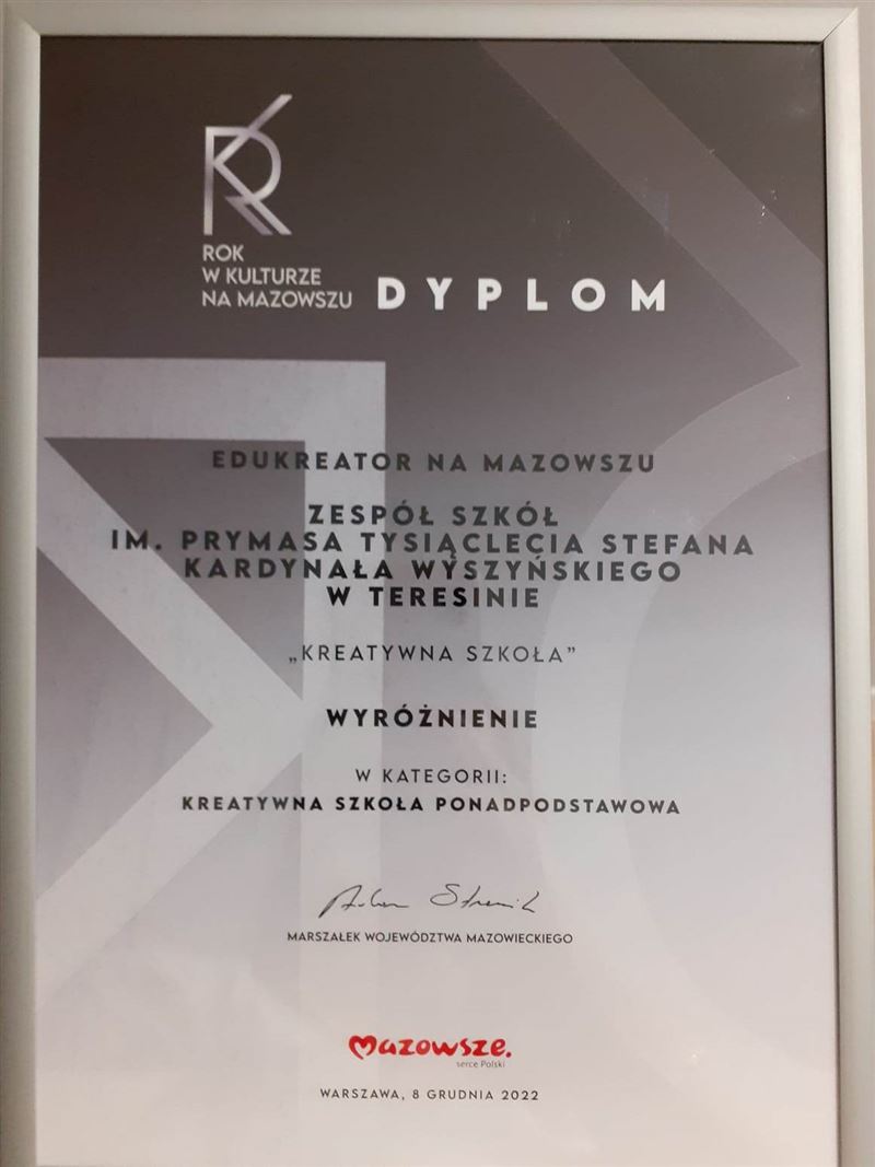 Specjalne wyróżnienie odebrał dyrektor szkoły Krzysztof Paradowski podczas uroczystej II Gali „Rok w Kulturze na Mazowszu”. Odbyła się ona 8 grudnia br. w Mazowieckim Teatrze Muzycznym im. Jana Kiepury w Warszawie, a jej organizatorem był samorząd województwa mazowieckiego. Zespół Szkół w Teresinie został uhonorowany za pomysł i realizację projektu o nazwie „Malczan”.