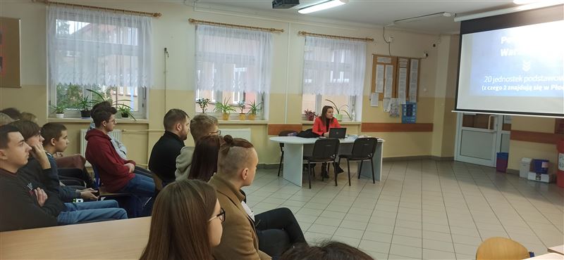 18 stycznia tegoroczni maturzyści uczestniczyli w spotkaniu z nauczycielem akademickim filii Politechniki Warszawskiej w Płocku. Małgorzata Brych-Dobrowolska przedstawiła ofertę Wydziału Budownictwa, Mechaniki i Petrochemii oraz Kolegium Nauk Ekonomicznych i Społecznych. Opowiedziała o wyposażeniu uczelni, programach nauczania, systemie przeliczania wyników maturalnych na punkty oraz udogodnieniach socjalnych oferowanych studentom.