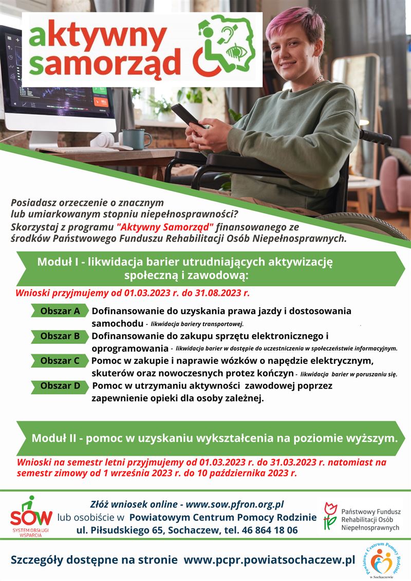 Skorzystaj z programu Aktywny Samorząd 22-02-2023 11:06 A A A W imieniu Powiatowego Centrum Pomocy Rodzinie w Sochaczew zachęcamy do udziału w programie "Aktywny Samorząd". Wnioski przyjmowane są od 1 marca do 31 sierpnia 2023 r. Szczegóły na plakacie. ZOBACZ GALERIE