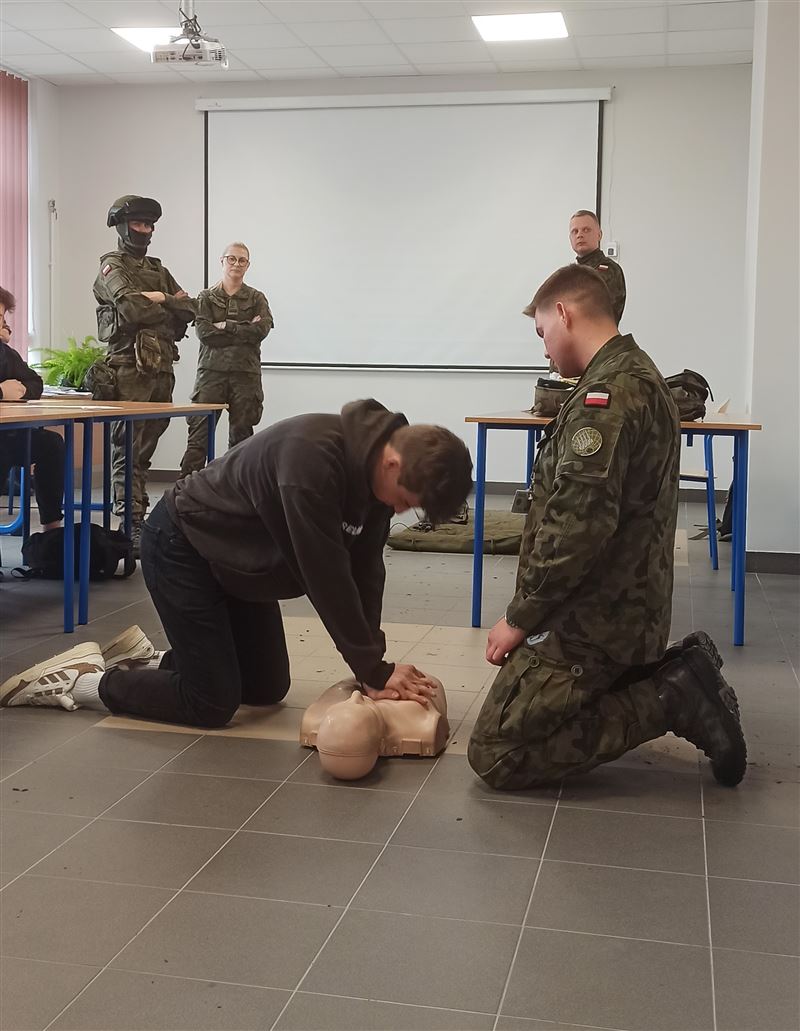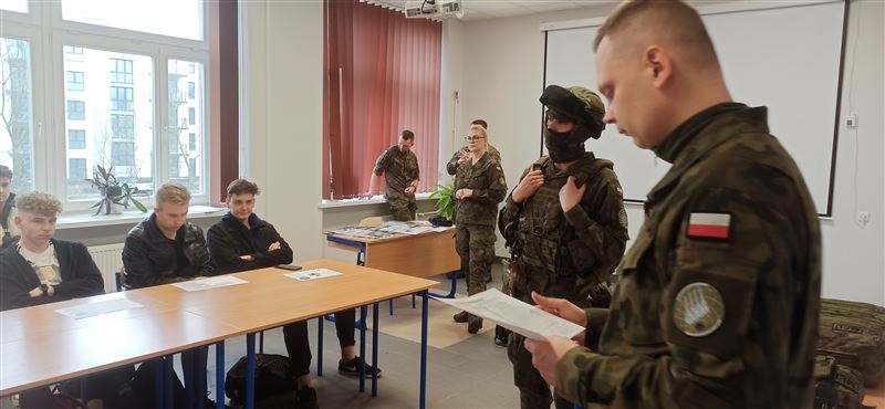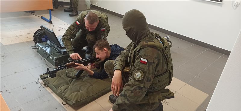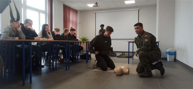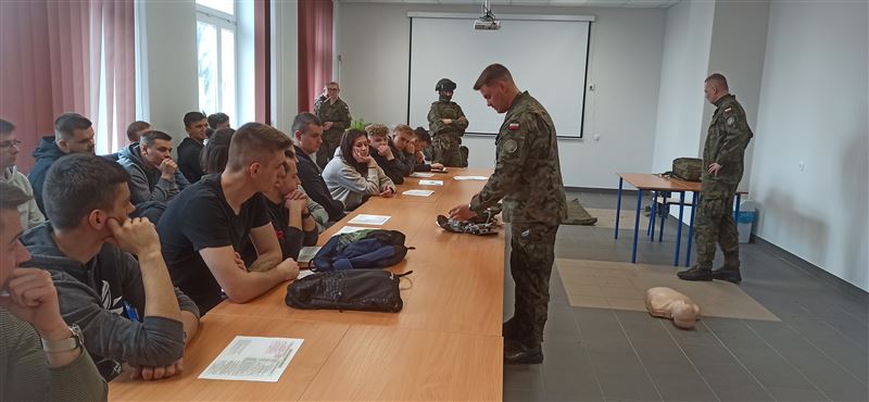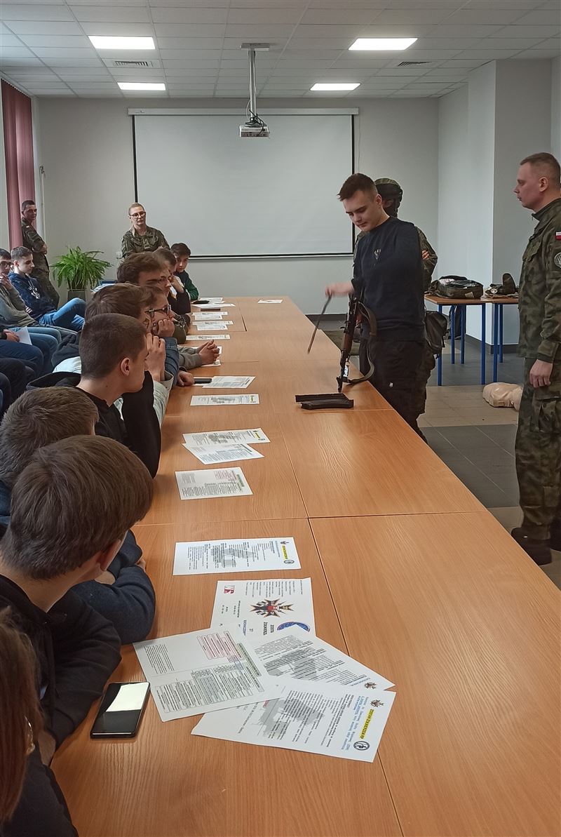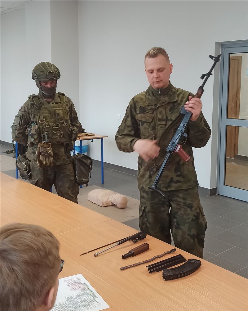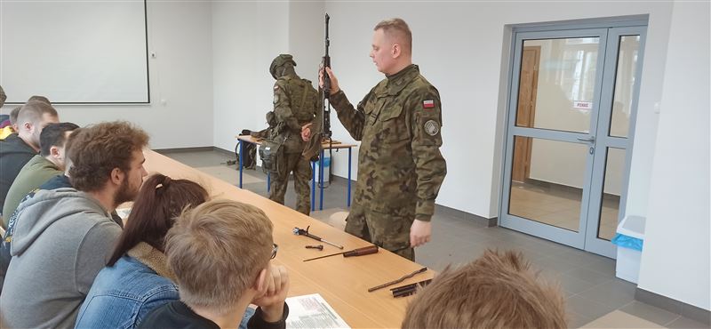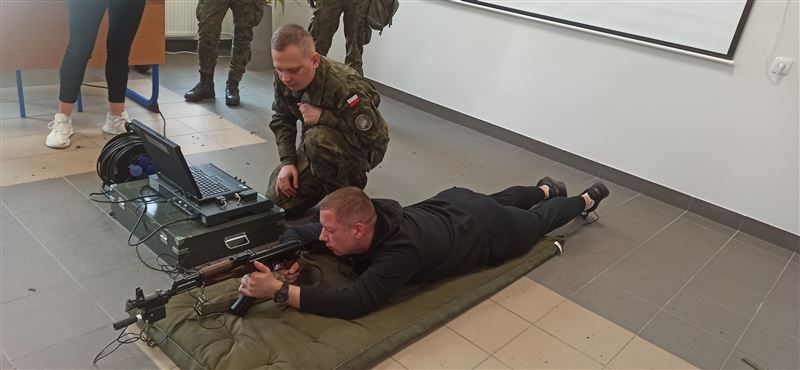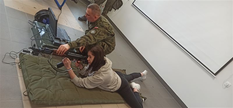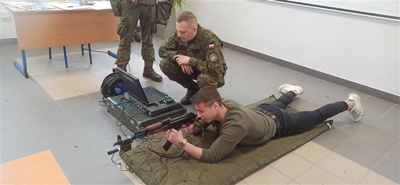 22 marca żołnierze z 37 Sochaczewskiego dywizjonu rakietowego Obrony Powietrznej spotkali się z uczniami ZS CKP w Sochaczewie. W spotkaniu, które odbyło się w sali konferencyjnej, uczestniczyli uczniowie czwartych klas technikum po szkole gimnazjalnej, którzy już powoli muszą podejmować decyzje odnośnie swojej zawodowej drogi po ukończeniu szkoły. Starszy kapral Krzysztof Duplicki, kapral Aneta Borsuk, kapral Łukasz Szymaniak, szeregowy Tomasz Kupczyk i szeregowy Jakub Michnowski zachęcali przyszłych absolwentów Osiemdziesiątki, żeby związali swoją przyszłość z wojskiem i sochaczewską jednostką. W interesujący i przystępny sposób przedstawili możliwości, które otwierają się przed zawodowymi żołnierzami, krok po kroku ścieżkę kariery i profity wynikające z Zawodowej Służby Wojskowej. Omówili również warunki, które należy spełnić, by zostać żołnierzem. Nasi goście nie ograniczyli się tylko do przekazywania tych wszystkich informacji. Przywieźli ze sobą wirtualną strzelnicę, dzięki której zainteresowani uczniowie mogli sprawdzić swoje umiejętności strzelania do celu. Kapral Łukasz Szymaniak (w niedawnej przeszłości uczeń ZS CKP) przeprowadził instruktaż obsługi karabinu, popularnie zwanego kałasznikowem. Okazało się, że niektórzy uczniowie są bardzo pojętni lub mają wrodzony talent do posługiwania się bronią, gdyż w dobrym czasie dawali radę rozłożyć i złożyć karabin. Szeregowy Jakub Michnowski, który w jednostce zajmuje się pomocą medyczną, zaprezentował wojskową apteczkę (której elementy wyposażenia różnią się od tych spotykanych chociażby w apteczkach samochodowych) i na fantomie zasady udzielania pierwszej pomocy.