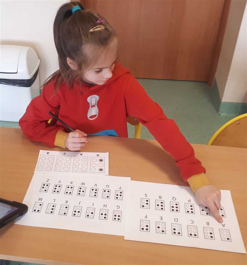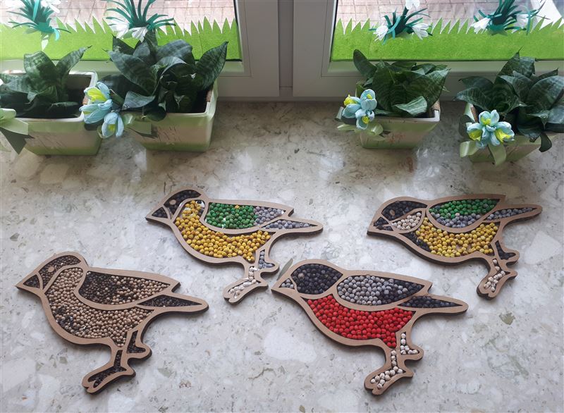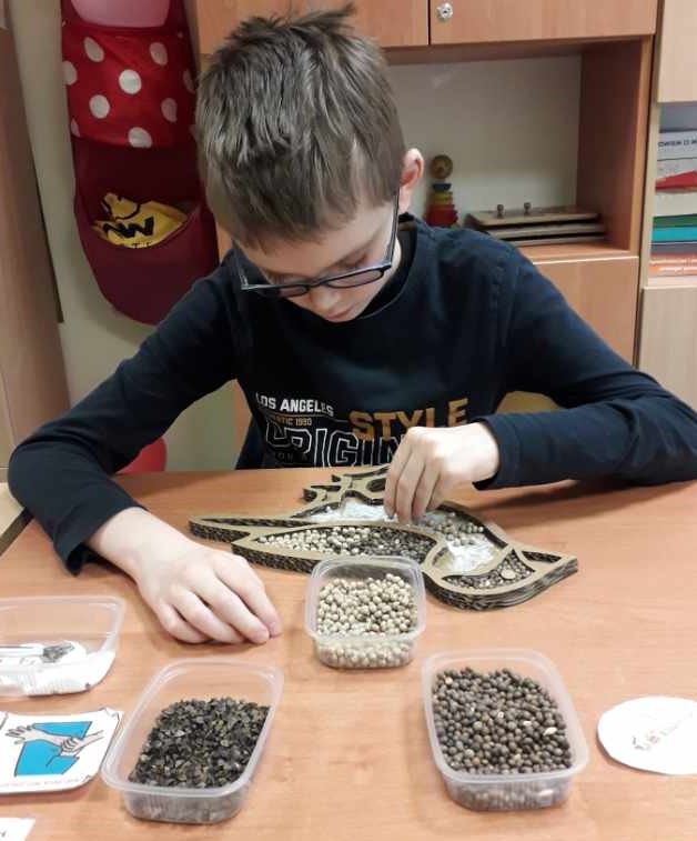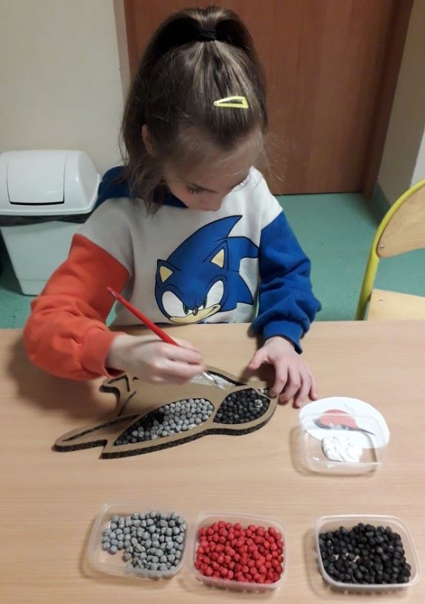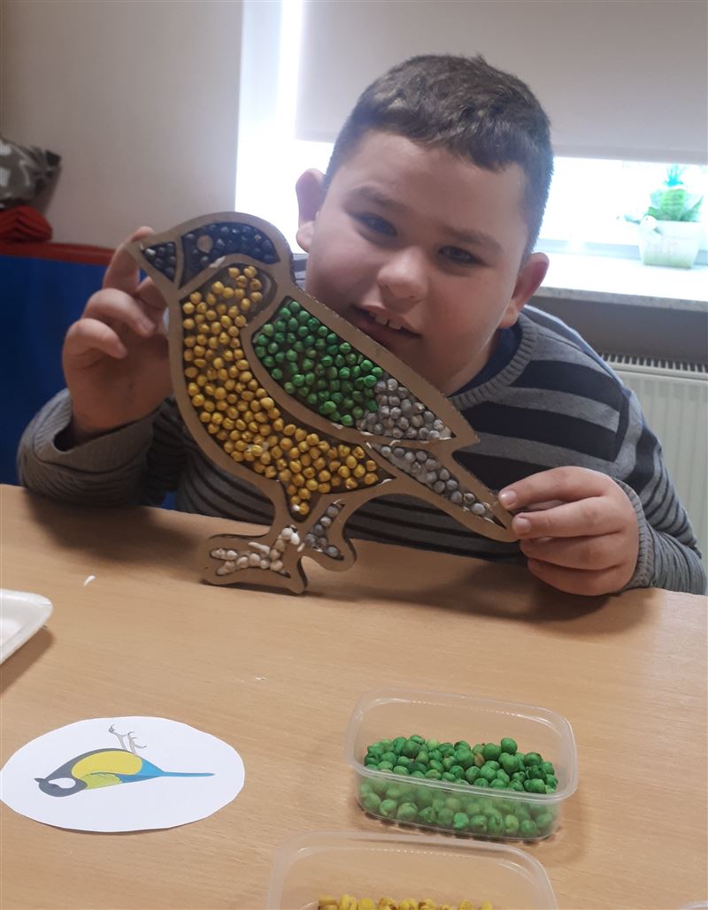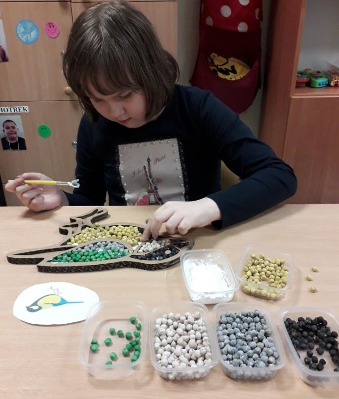 Obejrzeliśmy krótki filmik edukacyjny „N jak niewidomy” oraz zapoznaliśmy się z alfabetem Braille'a, po czym sami zakodowaliśmy swoje imiona alfabetem dla niewidomych. Na koniec wykonaliśmy piękne, sensoryczne ptaki przy użyciu różniących się fakturowo ziaren: kolorowej cieciorki, ryżu, naturalnych nasion łubinu, gryki.
