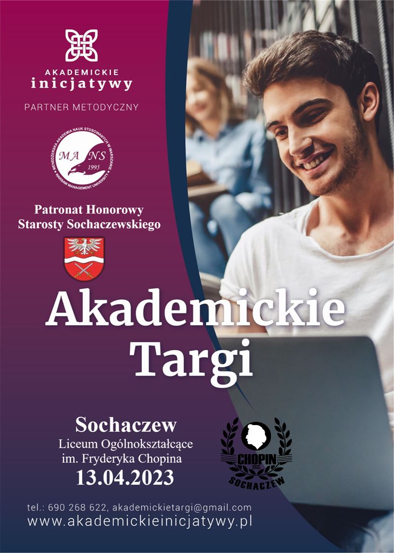 Już w najbliższy czwartek - Akademickie Targi w Sochaczewie – 13 kwietnia w Liceum Ogólnokształcącym im. Fryderyka Chopina przy ul. 15 Sierpnia 4 w godzinach 12:00-14:30 na sali gimnastycznej.