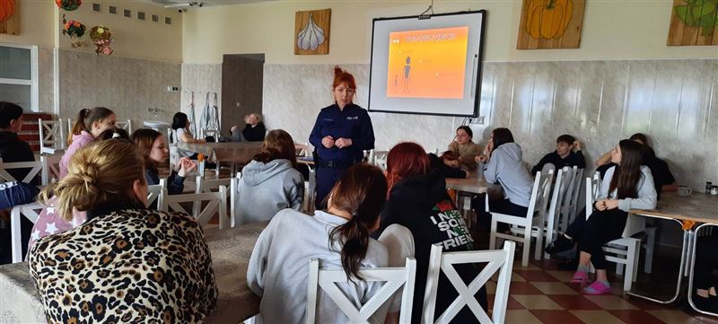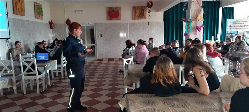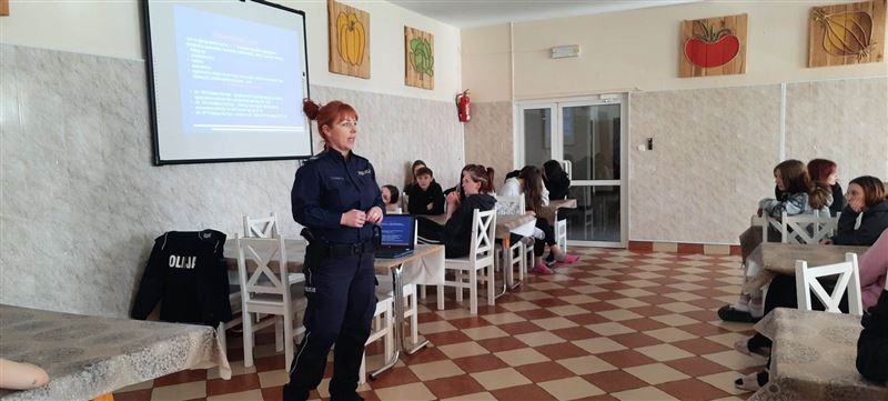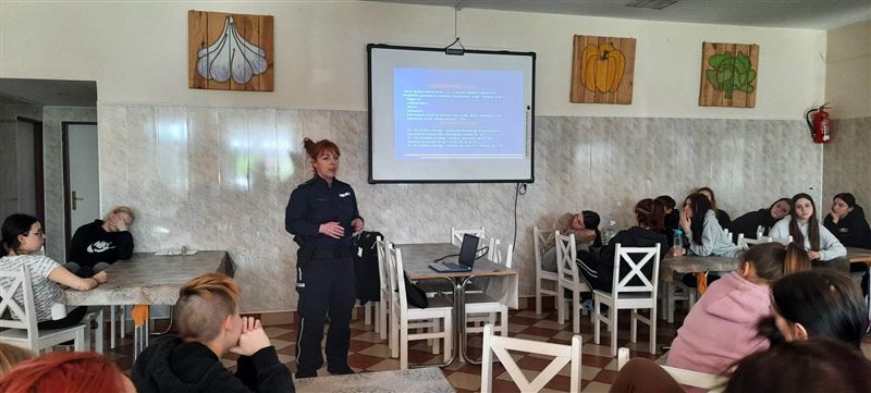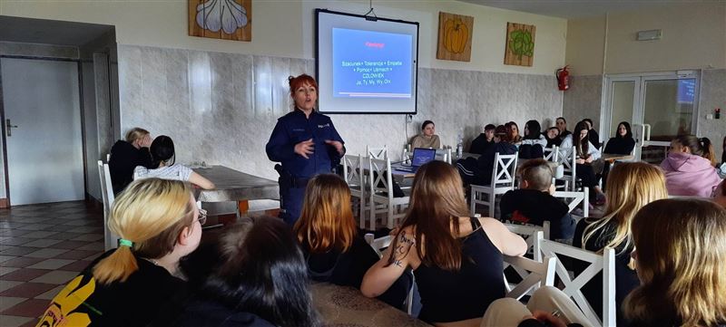 W poniedziałek, 3 kwietnia na zaproszenie Agnieszki Ambroziak, dyrektor placówki – Młodzieżowego Ośrodka Wychowawczego w Załuskowie - nasz ośrodek odwiedziła sierż. szt. Milena Godos z Wydziału Prewencji Zespołu ds. Profilaktyki Społecznej, Nieletnich i Patologii z KPP Sochaczew, która wygłosiła prelekcję dotyczącą przemocy rówieśniczej wśród młodzieży. Celem zajęć było podniesienie wiedzy na temat zjawiska przemocy rówieśniczej w świecie realnym i cyberprzemocy, reagowania i możliwości pomocy w sytuacji doznawania przemocy ze strony rówieśników lub bycia jej świadkiem.