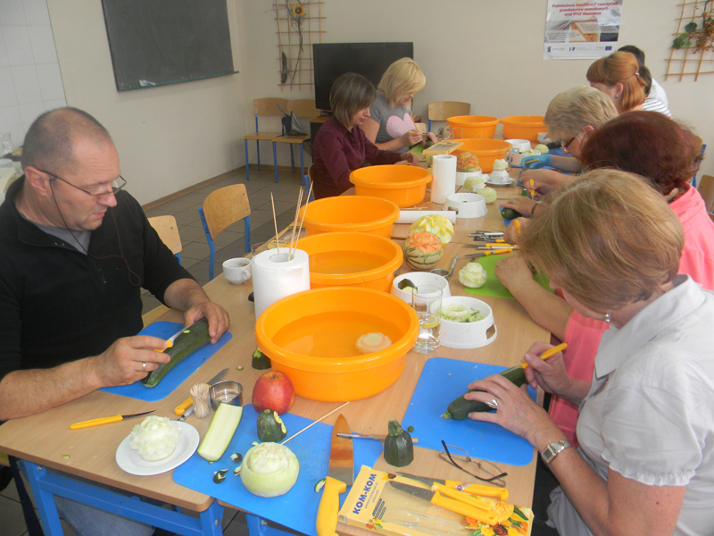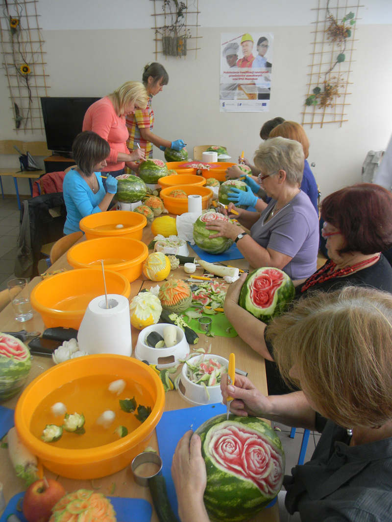 Kolejna grupa nauczycieli przedmiotów zawodowych z branży gastronomicznej podnosi swoje kwalifikacje na kursie Carvingu realizowanym w ramach Projektu „Podniesienie kwalifikacji nauczycieli przedmiotów zawodowych i IPNZ Mazowsza” współfinansowanego przez Unię Europejską ze środków Europejskiego Funduszu Społecznego na podstawie umowy nr UDA-POKL.09.04.00-14-059/11.