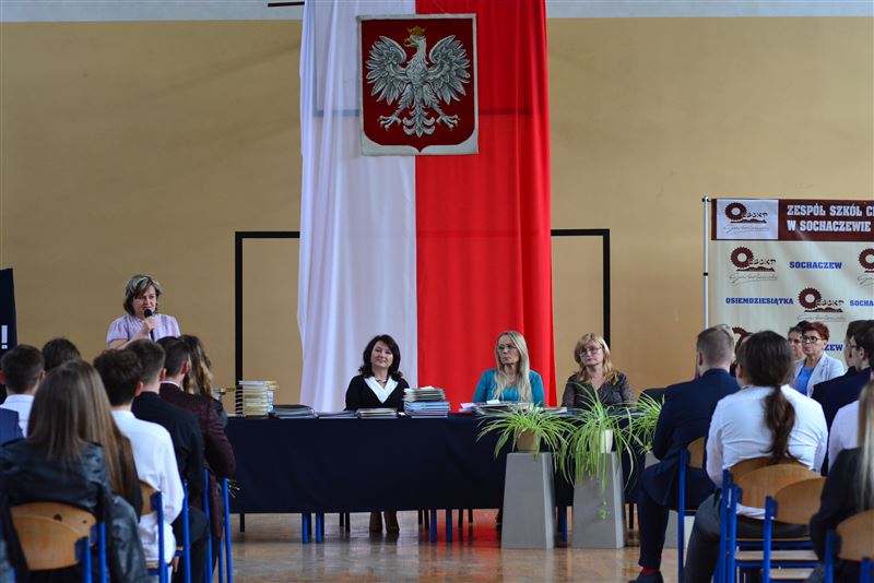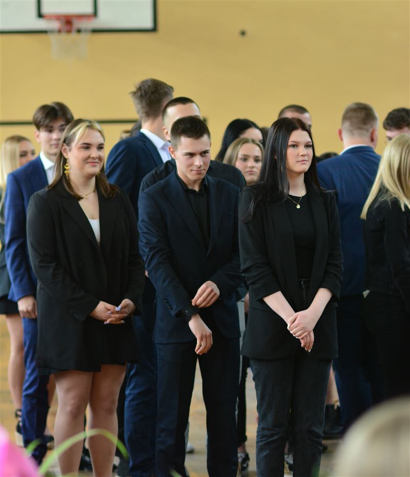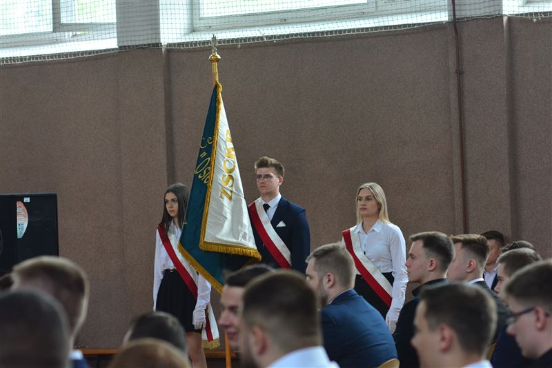 Taki dzień zdarza się raz w życiu, jeszcze tylko matura i można rozpoczynać nowy etap edukacji. Scenariusz uroczystości co roku ulega pewnym modyfikacjom, ale niektóre elementy są stałe. Jak zawsze uczniowie zgromadzili się w sali gimnastycznej, a sama uroczystość rozpoczęła się od przekazania sztandaru – kończący szkołę uczniowie przekazują go młodszym kolegom. Natalia Chmielecka, Patryk Słoma i Małgorzata Izydorek przekazali sztandar swoim kolegom, których reprezentowali: Kuba Fabisiak z klasy IVb Technikum oraz Aleksandra Świtkiewicz i Natalia Janicka z klasy III a Liceum. Udział w poczcie sztandarowym szkoły to wyróżnienie dla każdego ucznia.