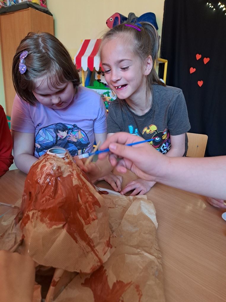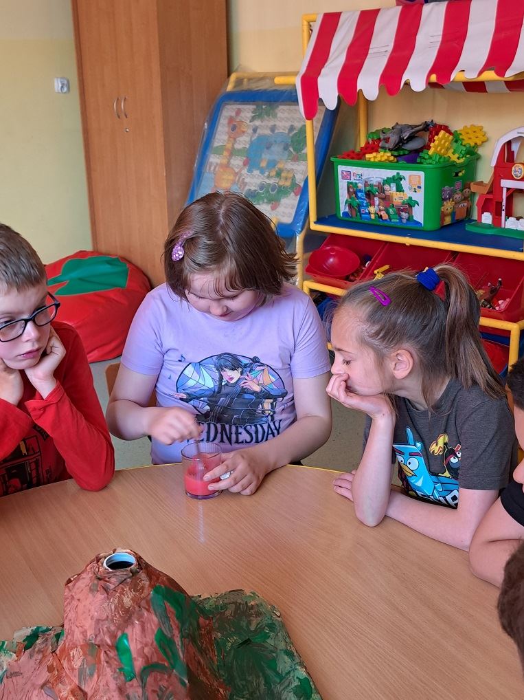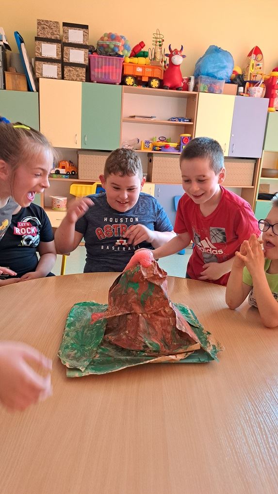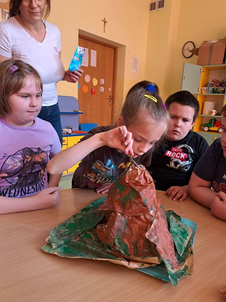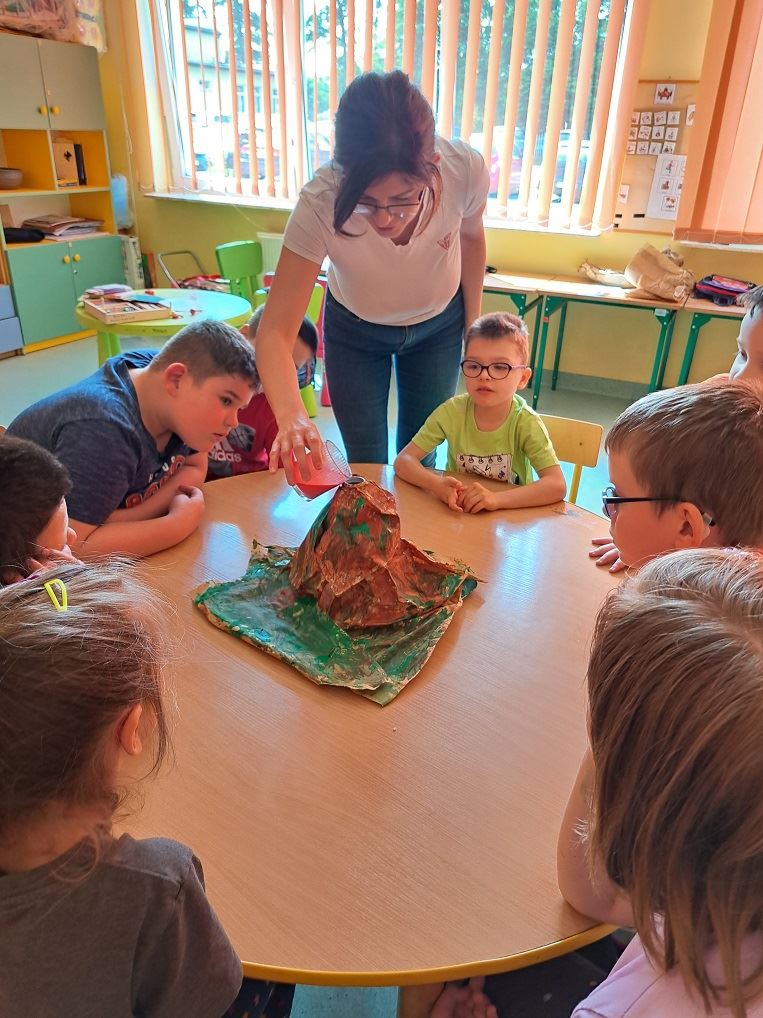 Na początku dzieci obejrzały zdjęcia różnych wulkanów oraz film a następnie odpowiedziały na kilka pytań. Następnie odbyła się cześć praktyczna, gdzie dzieci przygotowały makietę wulkanu oraz przeprowadziły eksperyment a z wulkanu wypłynęła lawa! Moment wybuchu wywołał u dzieci ekscytacje i olbrzymią radość.