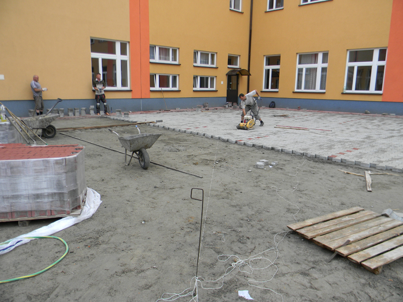 Trwają intensywne prace przy Poradni Psychologiczno-Pedagogicznej i ZS CKP. Pracownicy z firmy DECOR z gminy Młodzieszyn, która to wygrała przetarg na utwardzenie placu wraz z dojazdem, kładą aktualnie kostkę brukową. Prace mają być zakończone w połowie sierpnia.