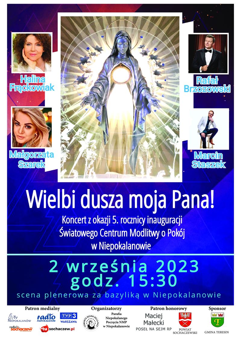 Koncert w Niepokalanowie 30-08-2023 08:21 A A A Zapraszamy do Niepokalanowa w sobotę, 2 września na wyjątkowy koncert z okazji 5 rocznicy inauguracji Światowego Centrum Modlitwy o Pokój. Wydarzenie jest pod patronatem honorowym starosty sochaczewskiego Jolanty Gonta. ZOBACZ GALERIE