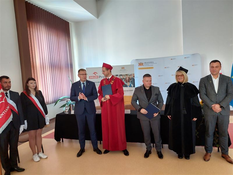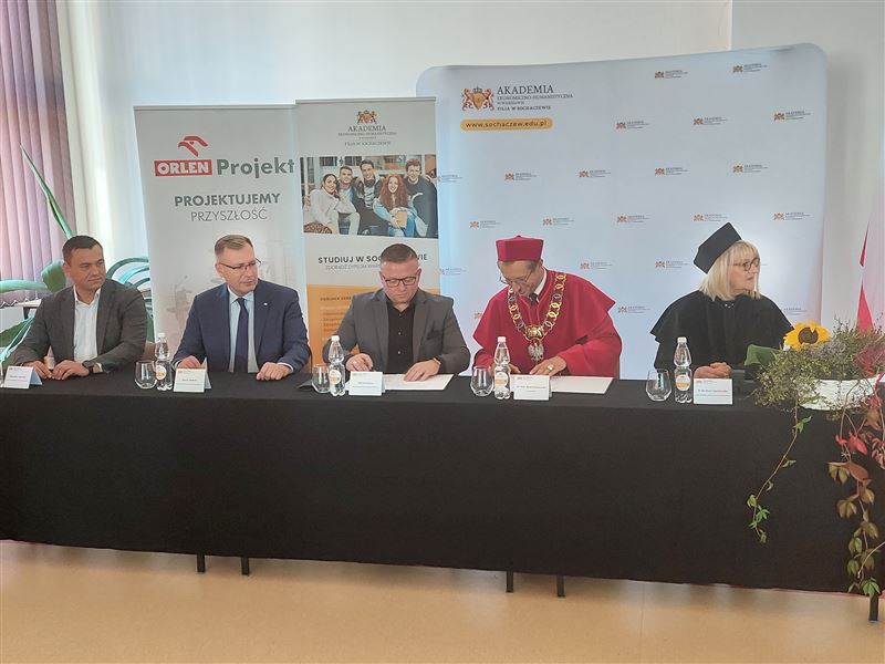 - W Ministerstwie Aktywów Państwowych zachęcamy Spółki Skarbu Państwa do współpracy z polskimi uczelniami. Do angażowania się w mniejszych ośrodkach. Cieszę się, że spółka Orlen Projekt podpisała umowę o współpracy z Akademią Ekonomiczno-Humanistyczną w Warszawie filia w Sochaczewie. Widzę tu korzyść i dla uczelni, dla studentów, dla rozwoju tej szkoły wyższej w naszym mieście, ale i dla grupy ORLEN. Ponieważ funkcjonowanie ORLENU na konkurencyjnym międzynarodowym rynku to nie tylko inżynierowie, skomplikowane projekty czy instalacje. To też dobre zarządzanie. To jest liczenie kosztów, ich kontrolowanie, planowanie, logistyka. I w tym wszystkim warto wykorzystywać wiedzę polskiej nauki i wychwytywać talenty – mówił do zebranych wiceminister Maciej Małecki tuż po podpisaniu umowy Uczelni z ORLEN Projekt.