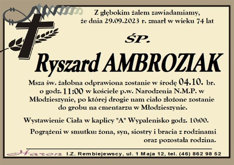 29 września br. w wieku 74 lat zmarł Ryszard Ambroziak, samorządowiec, który przez ponad 40 lat zaangażowany był mocno w sprawny lokalnej społeczności. Był radnym Rady Gminy w Iłowie a od 1998 roku nieprzerwanie przez 4 kadencje zasiadał w Radzie Powiatu w Sochaczewie, przez dwie kadencje w latach 2006-2010 oraz 2010-2014 był członkiem Zarządu Powiatu. Zawodowo związany przez 12 lat z Powiatowym Zarządem Dróg w Sochaczewie.