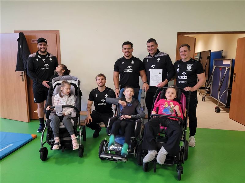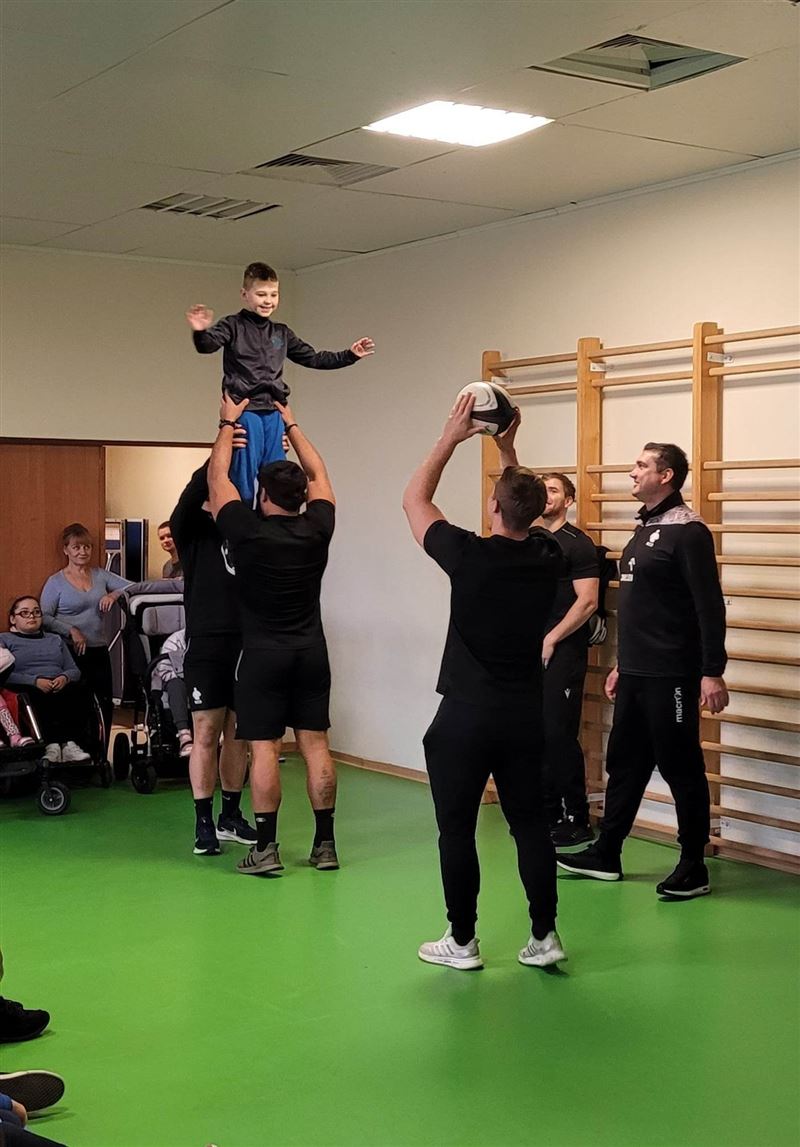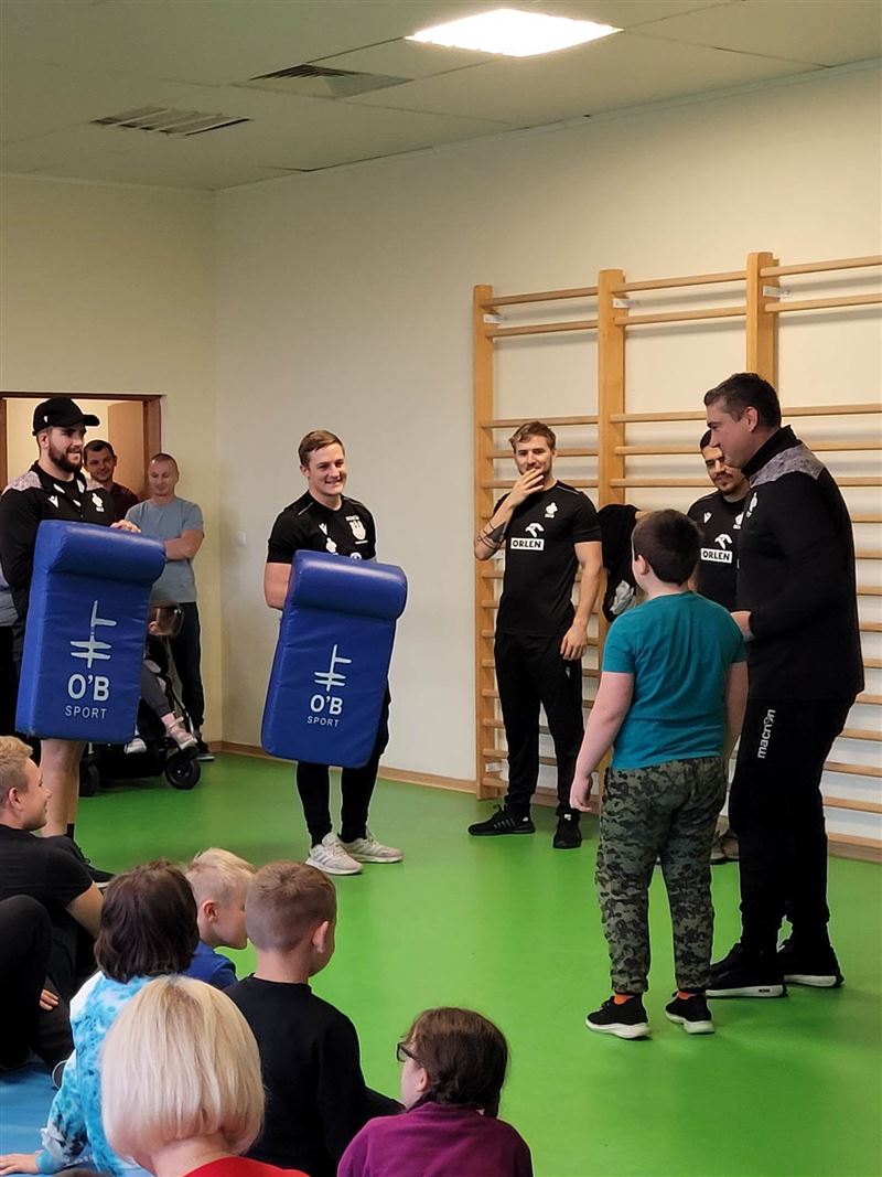 W środę naszą szkołę odwiedzili wyjątkowi goście, zawodnicy oraz trener Klubu Rugby Orkan Sochaczew, Mistrzowie Polski. Trener Maciej Brażuk oraz zawodnicy zaprezentowali uczniom w przystępny sposób podstawowe zasady rugby oraz elementy gry. Uczniowie mogli wspólnie ze sportowcami wykonać młyn, szarżę, aut itp. Sportowcy zachęcili do ćwiczeń nawet największych nieśmiałków. Wywołało to prawdziwą radość oraz ogrom pozytywnej energii. Uczniowie mieli również możliwość zadać zawodnikom pytania dotyczące gry,ale także życia jakie prowadzą w swoich krajach (Urugwaj, Argentyna). Społeczność szkolna otrzymała od sportowców koszulkę klubu, piłki oraz bilety na mecz, które umożliwią zrozumienie zasad rugby oraz zaszczepią w uczniach ducha zdrowej rywalizacji oraz potrzebę aktywności fizycznej. Jeszcze raz serdecznie dziękujemy naszym gościom za przybycie.