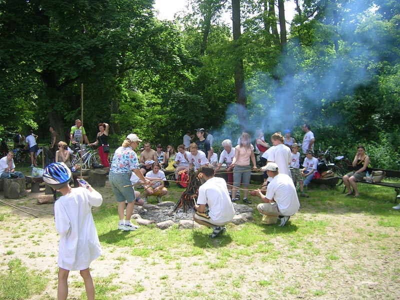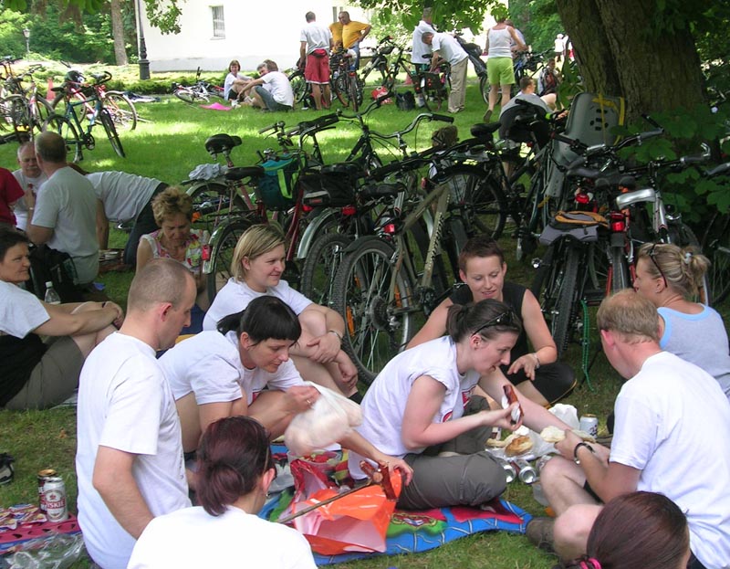 Rodzinny piknik w niesamowitej scenerii teresińskiego pałacu był przeżyciem wyjątkowym. Ognisko, misternie wypieczone kiełbaski, starodrzew parku dający kojący cień, soczysta zieleń i pachnące barwy kwiatów stworzyły prawdziwe sielankowy czas. Słodkie i niewinne leniuchowanie przeplecione było konkurencjami sprawnościowymi przygotowanymi przez Sławomira Cypla. Energetyczny i pożywny poczęstunek dla wszystkich uczestników pikniku przygotowała firma BAKOMA z Elżbietowa. Na koniec na wszystkich czekały jeszcze emocje związane z losowaniem nagród, a warto wspomnieć, że w tym roku aż dwóch szczęśliwców otrzymało nowe rowery ufundowane przez Starostwo Powiatowe w Sochaczewie. Po dwóch godzinach spędzonych w Teresinie peleton sprawnie ruszył przez Dębówkę i Kaźmierów do Sochaczewa. W sumie rowerzyści pokonali 48 km, jednakże nikt nie narzekał na zmęczenie.
