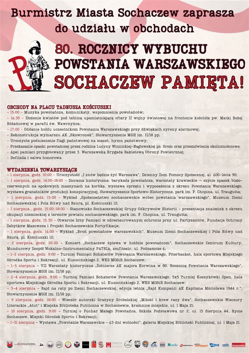 1 sierpnia przypada 80. rocznica wybuchu powstania warszawskiego. Tegoroczne obchody w Sochaczewie będą miały szczególny charakter. Oprócz tradycyjnego spotkania na placu Kościuszki o godzinie W przewidziano liczne turnieje sportowe, koncerty, wykłady i spotkania.