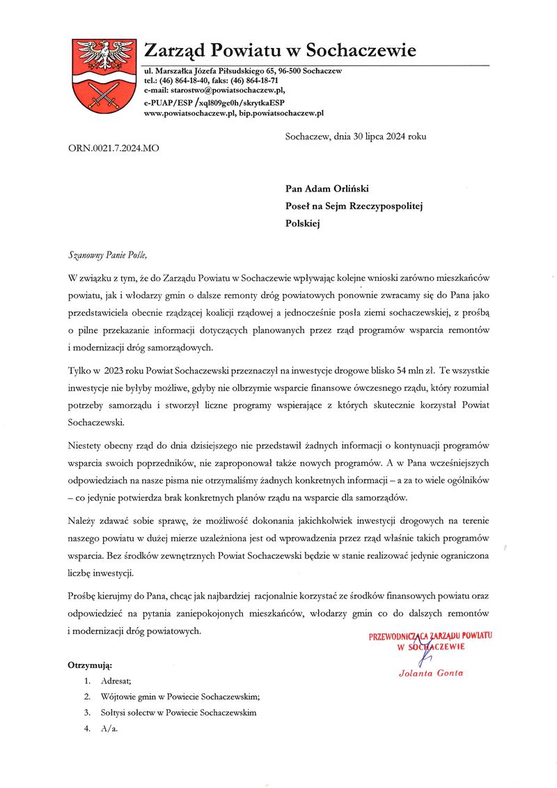 Zwracaliście się też jako Zarząd Powiatu z pismem do Mirosława Adama Orlińskiego, nowego posła ziemi sochaczewskiej.