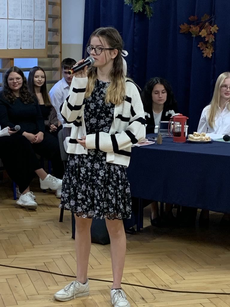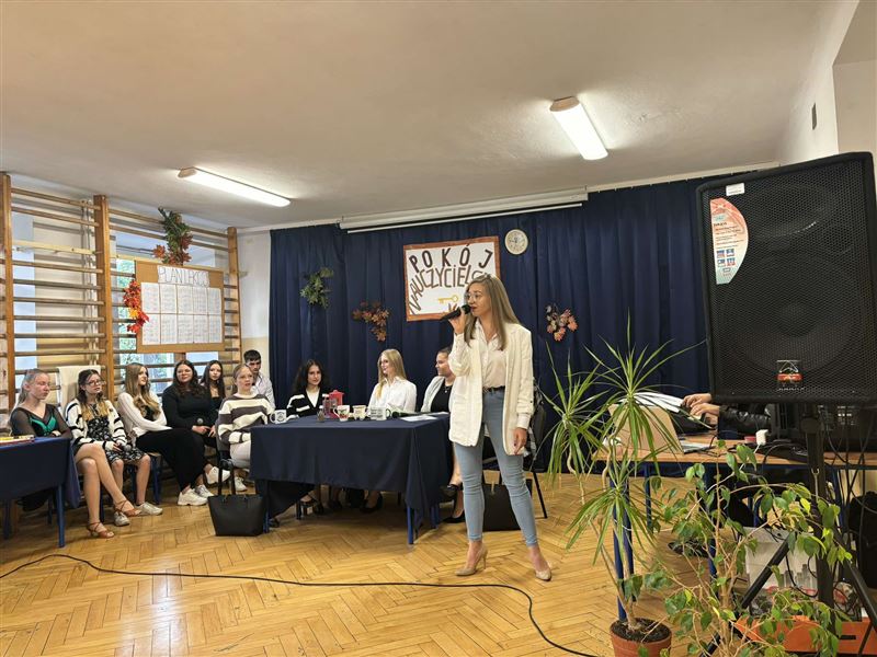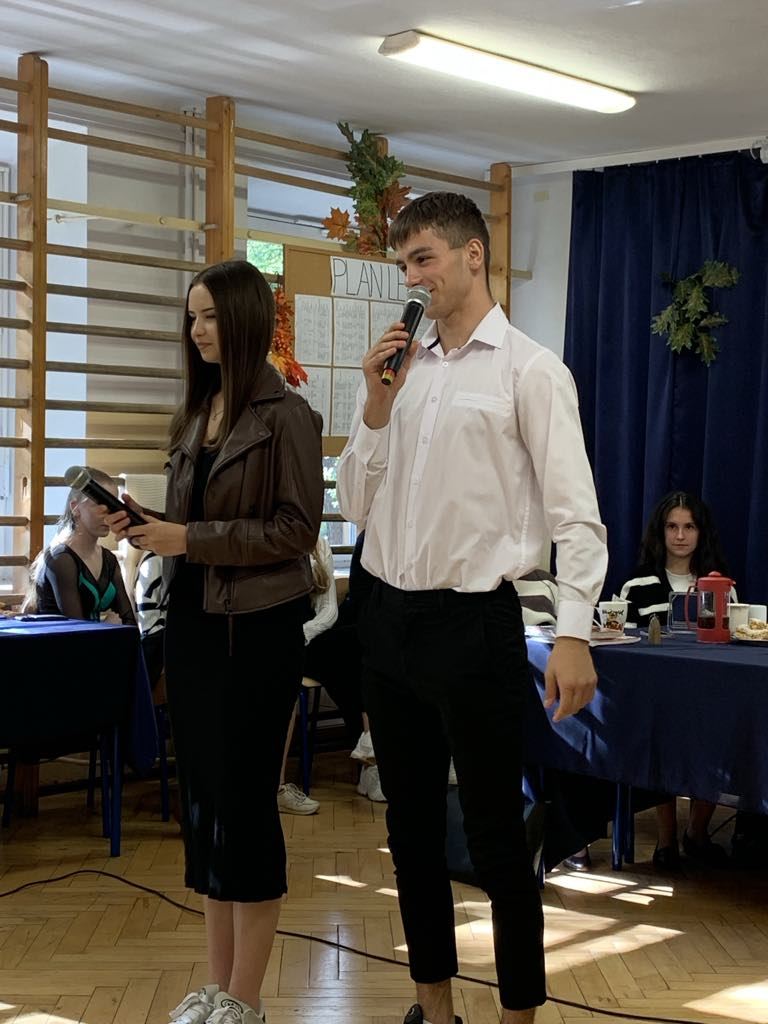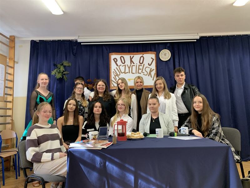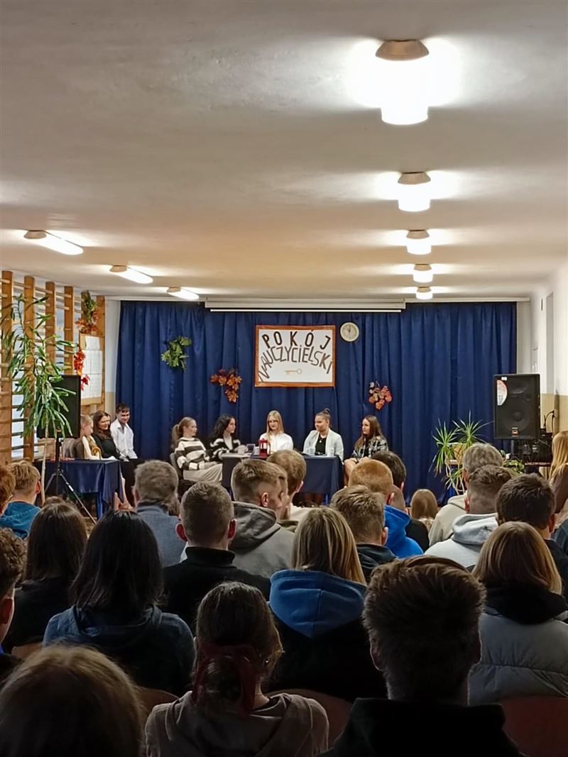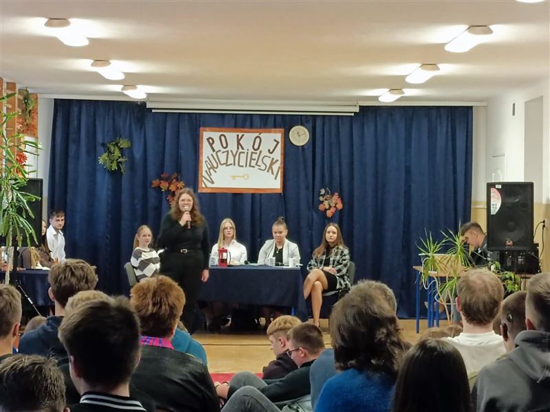 14 października obchodzony jest już od ponad 50 lat Dzień Edukacji Narodowej. Tego dnia uczniowie wyrażają wdzięczność nauczycielom i składają im życzenia. W tym roku przedstawiciele młodzieży z klasy drugiej i trzeciej liceum, pod kierunkiem nauczycielki języka polskiego pani Alicji Pawlak, postanowili uświetnić ten wyjątkowy dzień, przygotowując i wystawiając przedstawienie pt. „Duża przerwa”. Akcja spektaklu, jak można się domyśleć, rozgrywa się podczas dużej przerwy. Umiejscowiona jest w pokoju nauczycielskim, w którym na początku roku szkolnego spotykają się nauczyciele, którzy podczas rozmów poruszają aktualne dla współczesnej oświaty tematy. Nasi młodzi aktorzy (narratorzy – Nikola Simińska, Dawid Hetmanowski; recytacja – Weronika Trzaskowska i nauczycielki – Daria Dobrowolska, Julia Janczak, Amelia Balcerak, Maja Nowak, Natalia Kuran) pięknie wczuli się w swe role i byli bardzo realistyczni. Humorystycznie zaprezentowali różne typy ludzi, którzy mają różne zdania i podejście, zarówno do swej pracy jak i młodzieży i pokazali zadania, którym nauczyciele muszą sprostać. W trakcie przedstawienia usłyszeliśmy również, zmodyfikowane na potrzeby spektaklu, przeboje „Najtrudniejszy pierwszy krok”, „Jak się masz kochanie” i „Dziękujemy Wam” w brawurowym wykonaniu Oliwii Bartosiak, Zuzanny Stępień i Mai Grzegorek przy akompaniamencie Karola Połcia oraz obejrzeliśmy pokaz tańca nowoczesnego, który zaprezentowała Dorota Karbowiak.