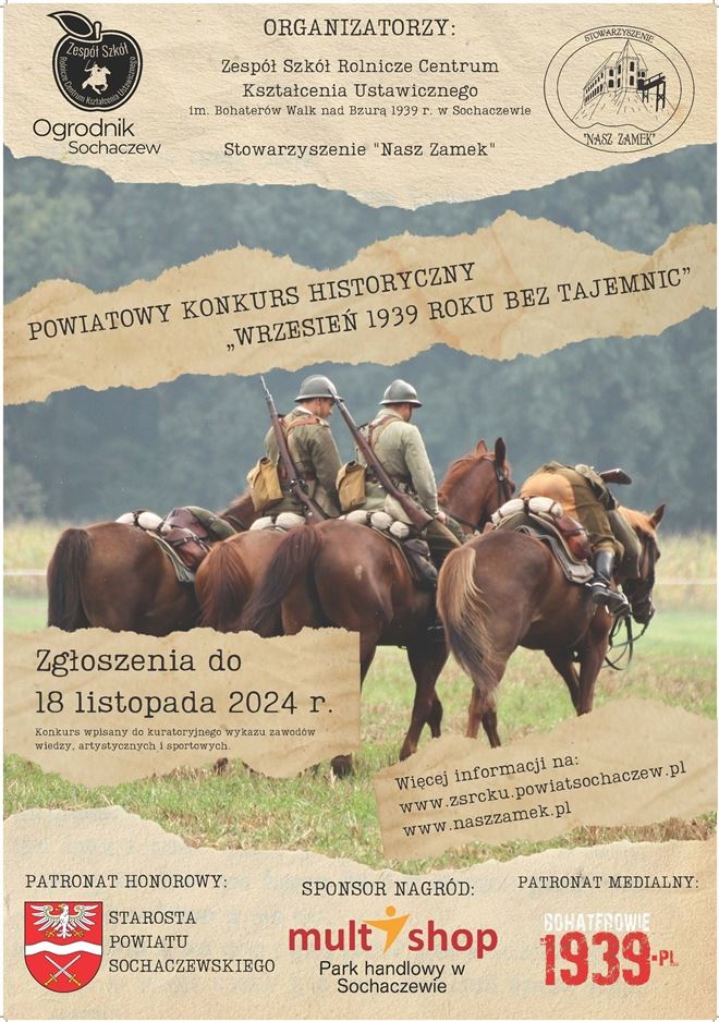 W imieniu organizatorów Zespołu Szkół Rolnicze Centrum Kształcenia Ustawicznego w Sochaczewie oraz Stowarzyszenia „ Nasz Zamek” mamy przyjemność zaprosić nauczycieli oraz uczniów do udziału w VIII edycji Powiatowego Konkursu Historycznego „Wrzesień 1939 roku bez tajemnic”. Tegoroczna edycja konkursu skierowana jest do uczniów klas szóstych, siódmych i ósmych szkół podstawowych. Tematyka zawodów historycznych obejmuje wojnę obronną Polski w 1939 roku ze szczególnym uwzględnieniem bitwy nad Bzurą.